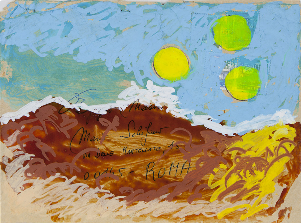 Mario Schifano Homs 1934 – Roma 1998 "Egregio Maestro Mario Schifano" Tecnica mista su busta da lettera cm 17,5x23,7 firmata in alto a dx Opera archiviata presso la Fondazione Mario Schifano Multistudio