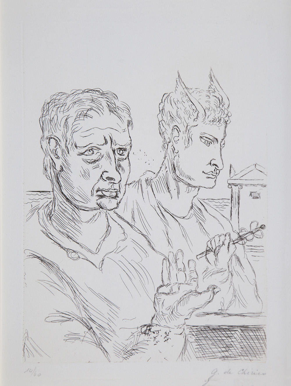 Giorgio De Chirico Volo 1888 – Roma 1978 "Autoritratto con Mercurio" acquaforte su carta esemplare n. 14/60 anno 1969 cm 50x40 firmata in basso a destra; numerata in basso a sinistra; certificato di autenticità della Galleria Spagnoli-Firenze al retro