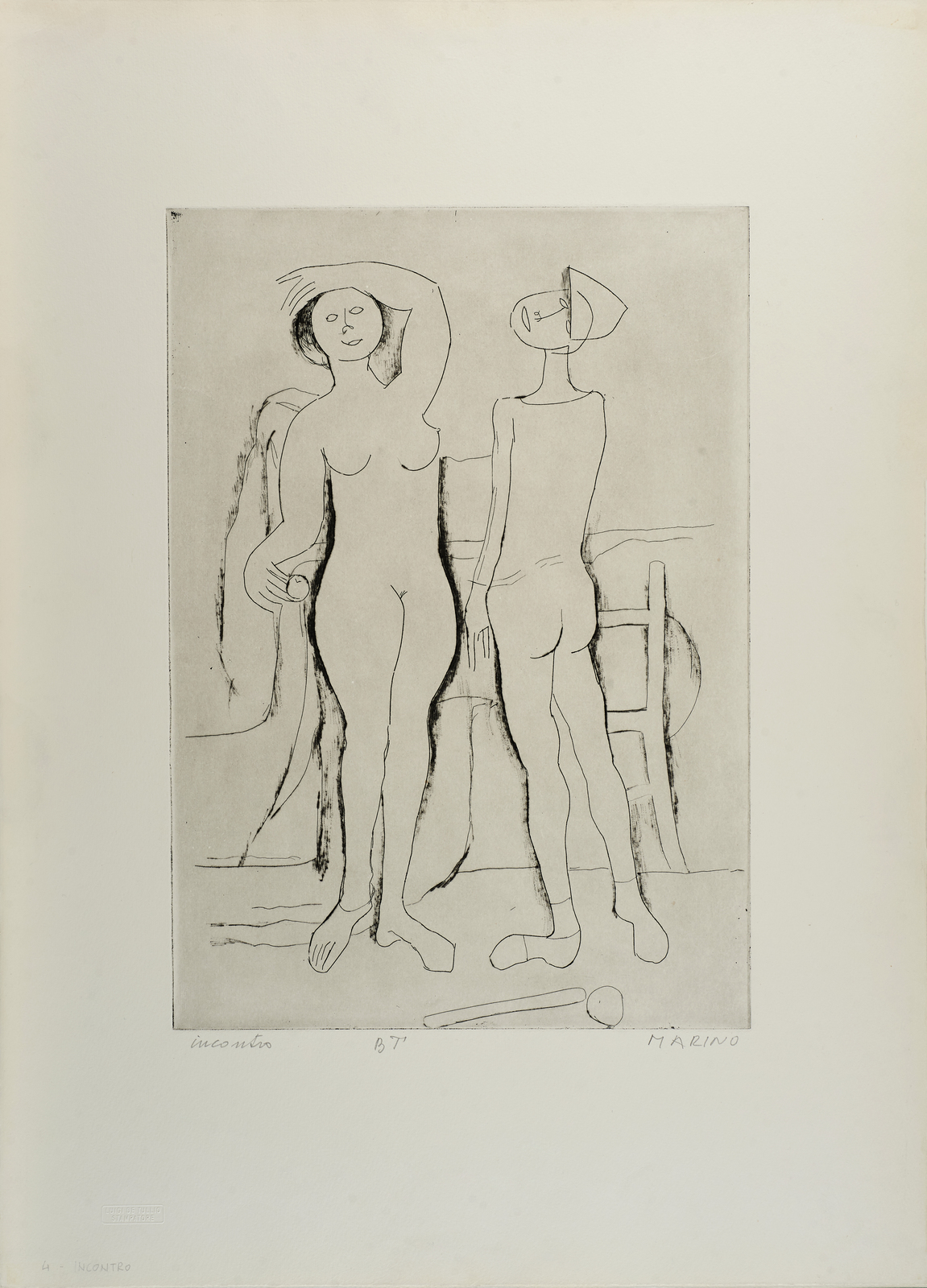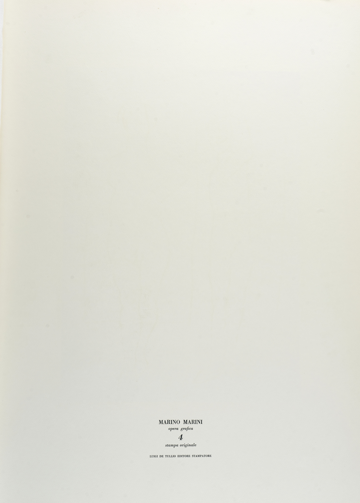 MARINI MARINO (1901 - 1980) Meeting. 1961. Etching. Cm 50,50 x 69,50. Title and singature lower in pencil. Luigi De Tullio printer stamp lower left. Arches France filigree. Plate size: 44x31 cm. Publications: Marino Marini twenty etchings, San Lorenzo Gallery, Florence, 26 April - 18 May 1975. Tribute to Marino Marini, thirty two graphics made from 1959 to 1972, Poggiali e Forconi Gallery, 25 October - 30 November 1986, Florence. Marino Marini Eine Grafische Folge, Luigi De Tullio editor,Milan, t.4.