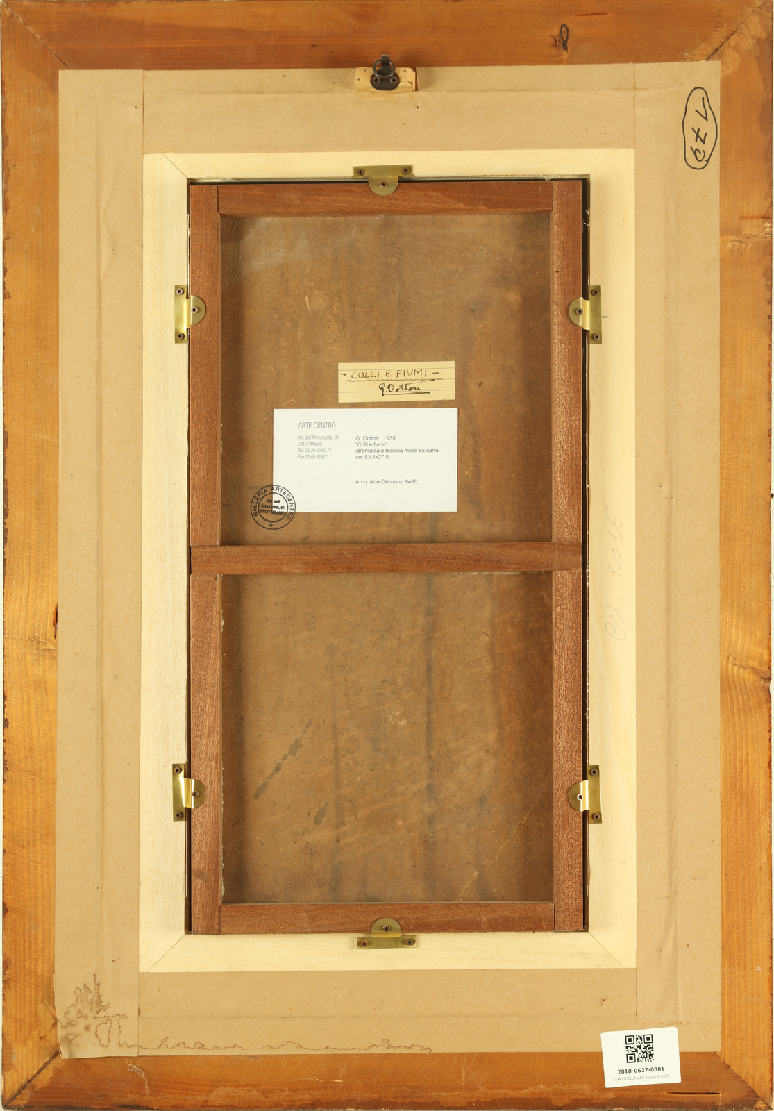 DOTTORI GERARDO (1884 - 1977) Colli e fiumi. 1935. Tempera su cartone. Cm 26,00 x 53,00. Metà anni '30. Firma in basso a destra. Al retro titolo, firma e cartiglio della Galleria Arte Centro, Milano, riportante numero di archiviazione. Scheda critica a cura di Massimo duranti (copia fotostatica). Provenienza: Galleria Artecentro Studio Lattuada, Milano; Collezione privata, Milano. Opera archiviata presso gli Archivi Gerardo Dottori, Perugia, come da documentazione fotografica allegata all'opera riportante il relativo numero d'inventario, Pubblicazioni: Catalogo Generale Ragionato, a cura di M. Duranti, EFFE Fabrizio Fabbri Editore, Perugia 2006, n.419, p.535. Cornice presente