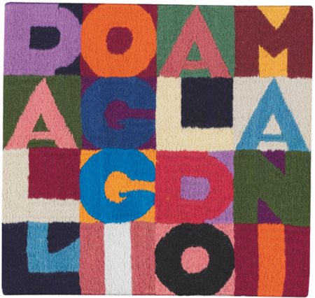 ALIGHIERO BOETTI 1940 - 1994 DALL'OGGI AL DOMANI signed on the reverse, embroidery. Executed in 1989 firmato sul risvolto arazzo cm 17,5x18,5 Eseguito nel 1989 Opera registrata presso l'Archivio Alighiero Boetti, Roma, con il n. 5646 L'opera è accompagnata da certificato su fotografia rilasciato dall'Archivio Alighiero Boetti, Roma PROVENANCE Collezione Gianni Michelagnoli, Venezia