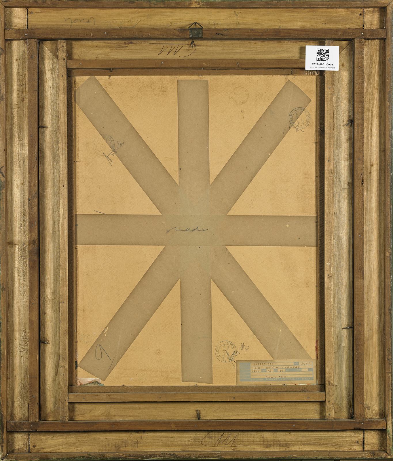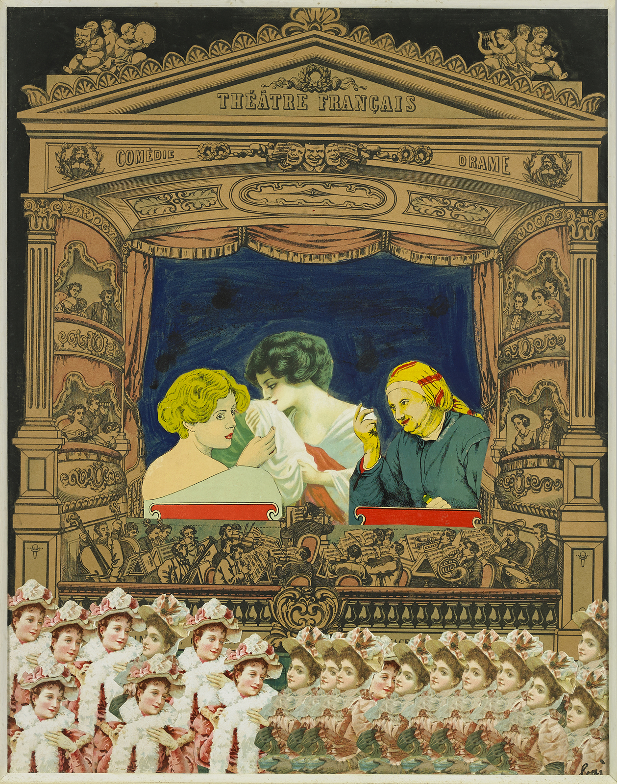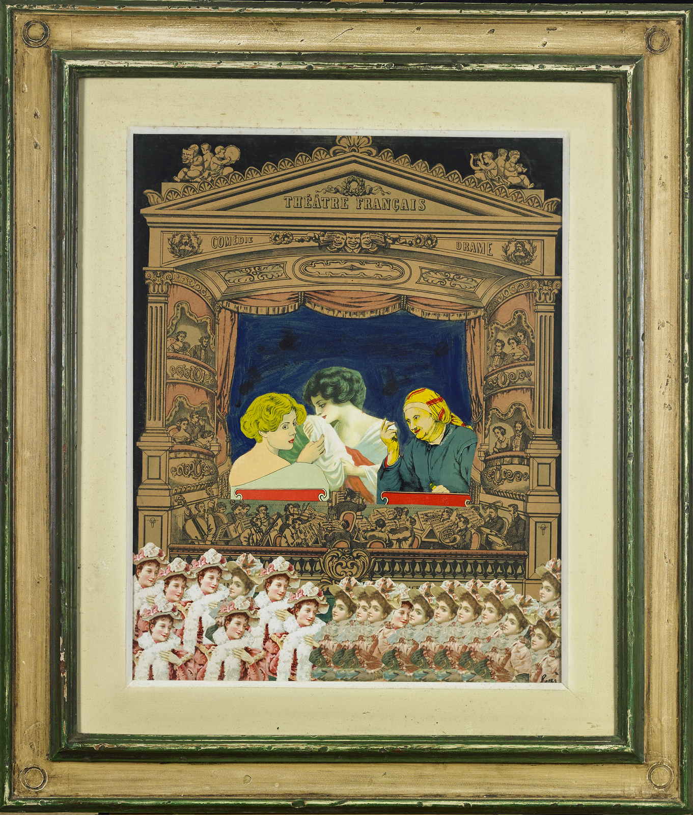 BAJ ENRICO (1924 - 2003) The French theatre. 1961. Tempera e collage di carte su cartone. Cm 40,00 x 50,00. Firma in basso a destra. Al retro cartiglio descrittivo e timbro Galleria Schwarz, Milano. Pubblicazione: Catalogo generale delle opere di Baj a cura di Enrico Crispolti, Giulio Bolaffi Editore, Torino, 1973, n. 757, pag.118 . Esposizione: Sevenarts Gallery, Londra, 1962, cat. n. 20. Cornice presente