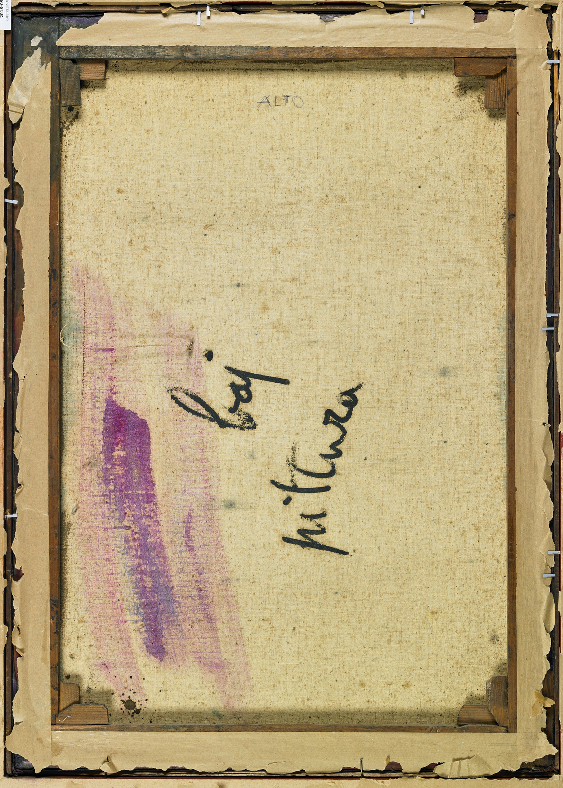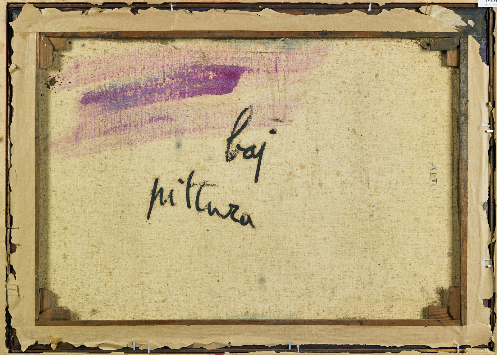 BAJ ENRICO (1924 - 2003) Pittura. 1953. Olio e smalto su tela. Cm 70,00 x 50,00. Titolo e firma al retro. Provenienza: Collezione Ettore Colla; Collezione Castiello, Napoli. Autentica su fotografia di Roberta Cerini Baj riportante il relativo numero d'inventario. Cornice presente