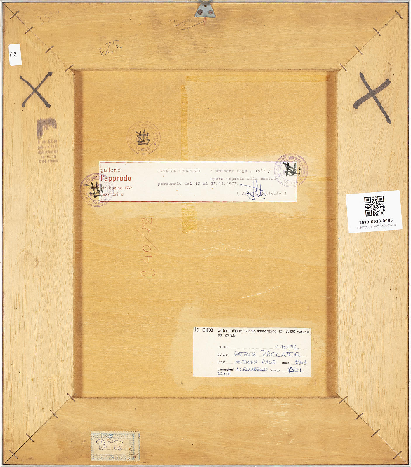 PROCKTOR PATRICK (1936 - 2003) Anthony page. 1967. Acquarello su carta. Cm 23,00 x 30,00. Firma e anno in alto a sinistra. Al retro cartiglio descrittivo Galleria l'Approdo, Torino e cartiglio della Galleria d'Arte La Città, Verona. Esposizione: Patrick Procktor, Galleria L'Approdo, Torino, 10 - 27 Novembre 1977. Cornice presente