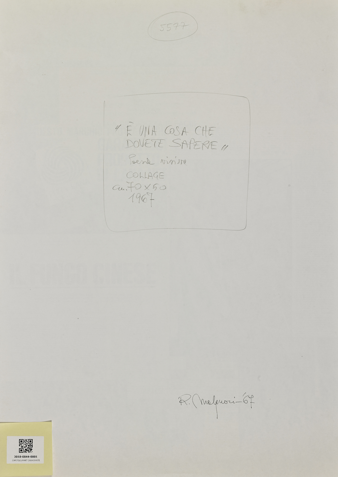 MALQUORI ROBERTO (n. 1929) Untitled (E' una cosa che dovete sapere). 1967. Collage on paper. Cm 50,00 x 70,00. At the back title, signature and year.