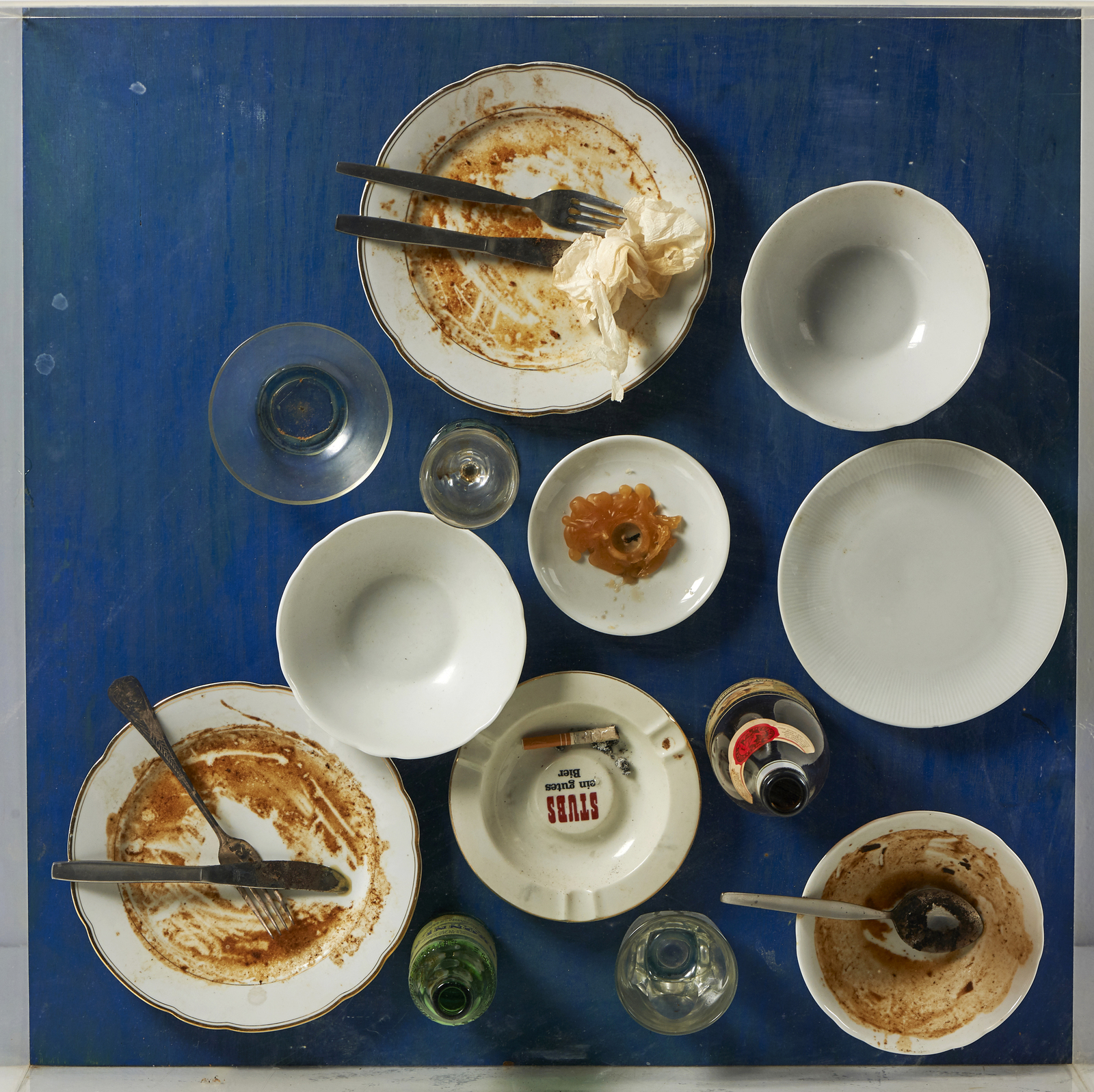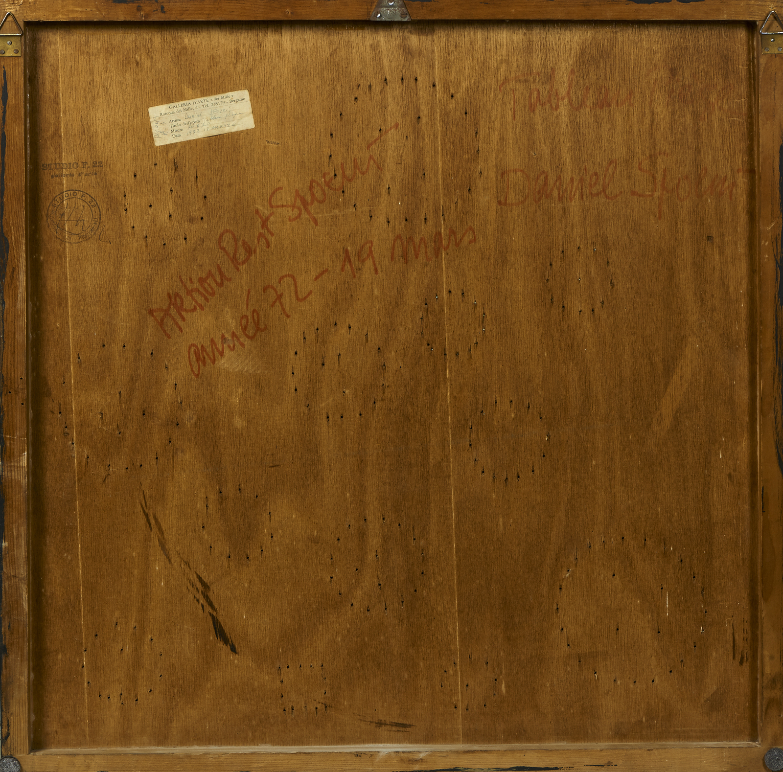 SPOERRI DANIEL (n. 1930) Aktion Restaurant Spoerri. Tableau Piege. (19 Mars). 1972. Mixed media and assembly. Cm 70,00 x 70,00 x 40,00. At the back title, signature, year, Dei Mille Art Gallery,Bergamo label and Studi F22 Art Gallery stamp. Provenance: Studio F22 Art Gallery. Dei Mille Art Gallery, Bergamo. EAT.ART&AB.ART Daniel Spoerri - Barbara Raderscheidt authenticity certificate on photo.