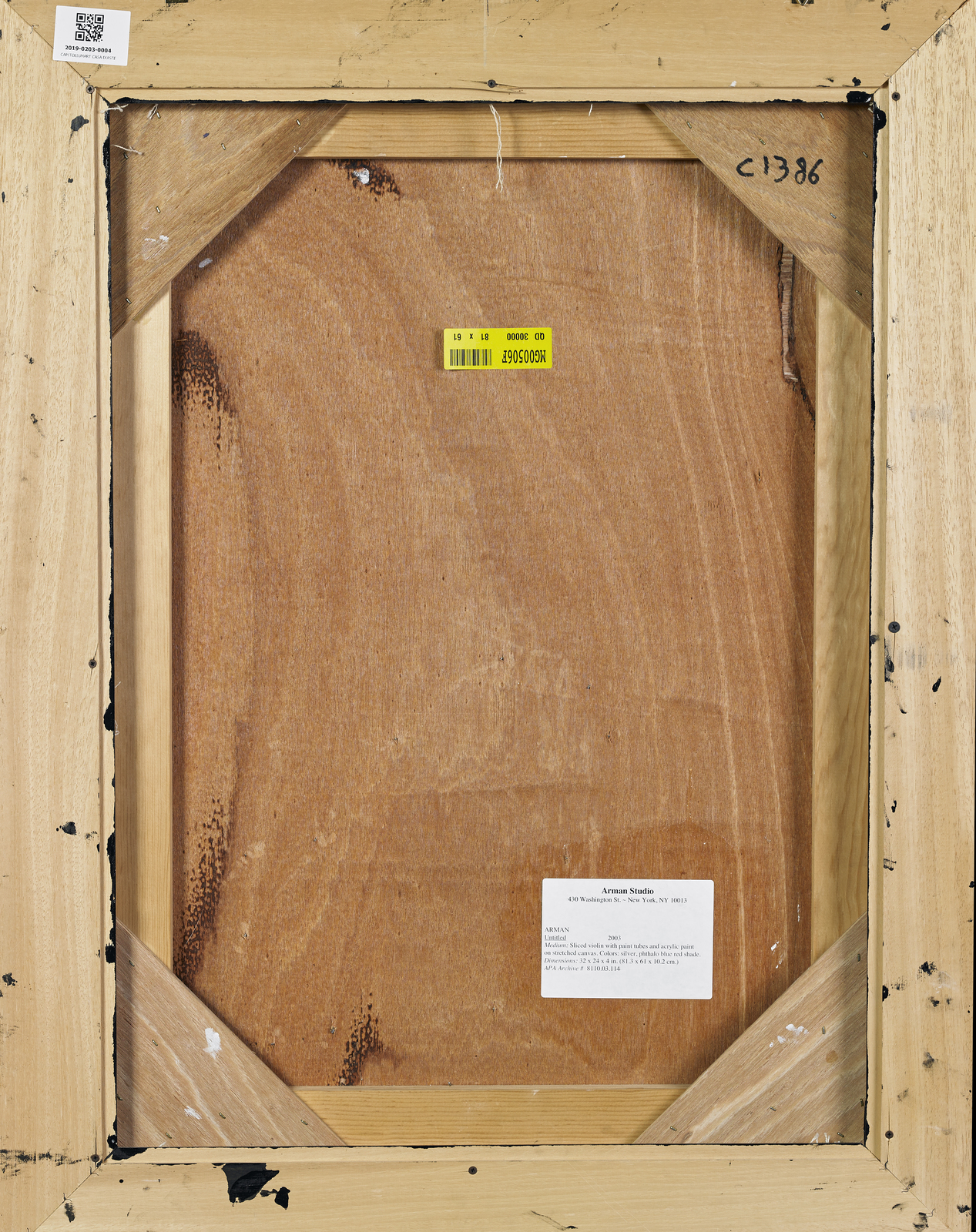 ARMAN FERNANDEZ (1928 - 2005) Senza titolo. 2003. Tecnica mista e applicazioni su tela. Cm 61,00 x 81,00 x 10,00. Al retro cartiglio descrittivo Studio Arman, New York. Opera archiviata presso lo Studio Arman, New York come da documentazione fotografica allegata all'opera riportante il relativo numero d'inventario e la firma dell'artista. Entro teca di plexiglass.