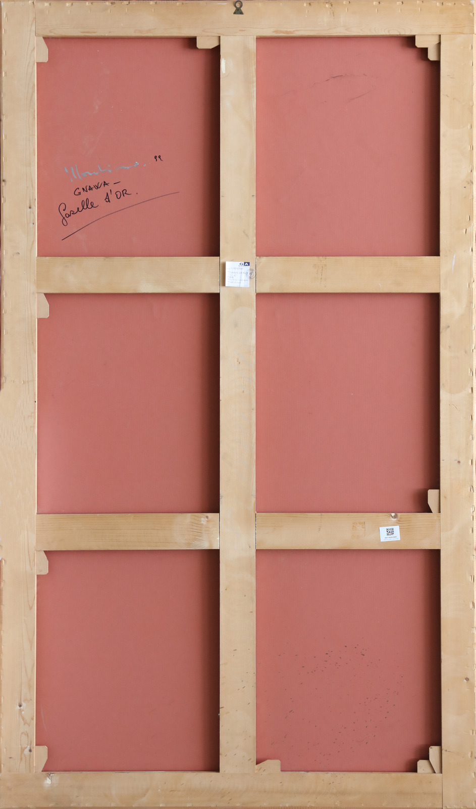MONDINO ALDO (1938 - 2005) Gnawa - Gazelle d'or. 1999. Oil on linoleum. Cm 130,00 x 220,00. At the back title, signature, year and Astuni Gallery, Fano label with samp. Publication: Aldo Mondino exhibition catalog, L'incontro Art Gallery, Chiari, 16 March - 7 April 2002, p.17.
