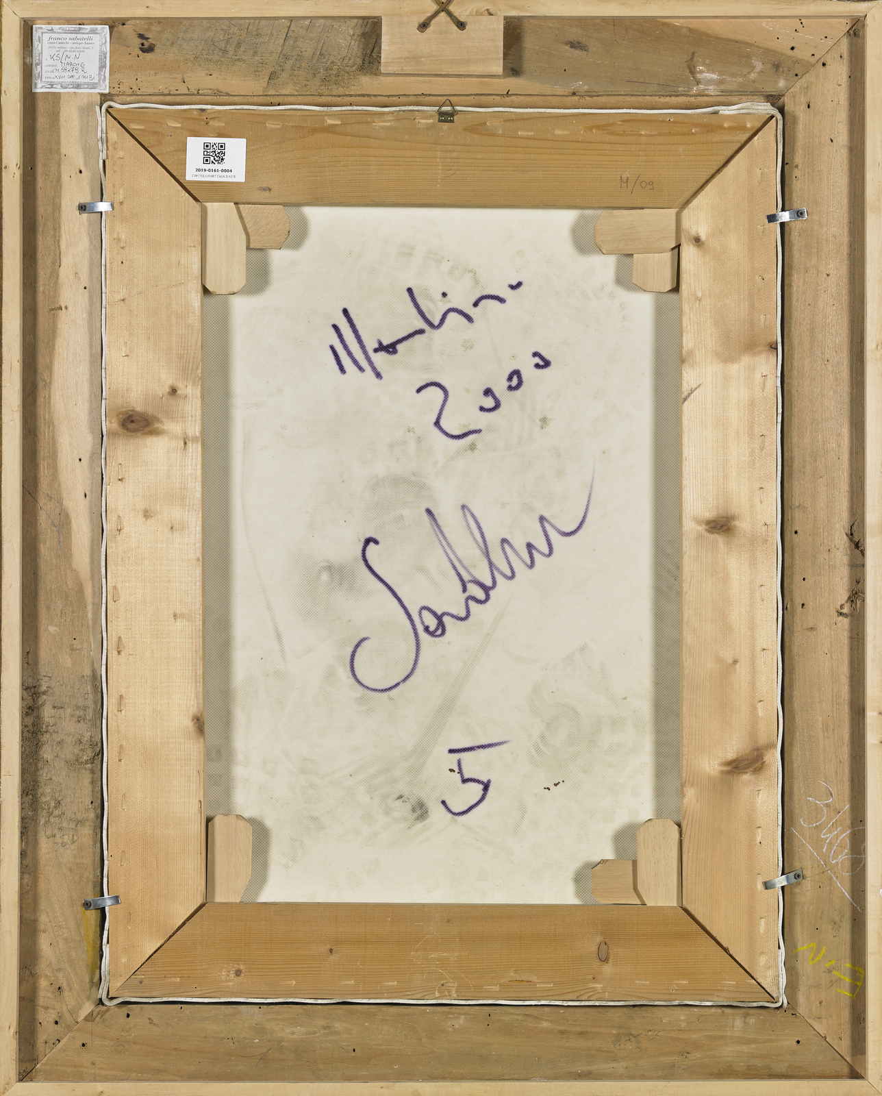 MONDINO ALDO (1938 - 2005) Sodhu. 2000. Oil on linoleum. Cm 60,00 x 80,00. At the back title, signature and year. Provenance: Astuni Art Gallery, Fano. Cornice presente