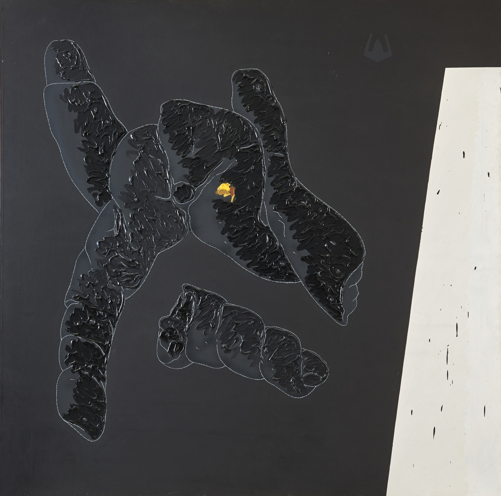 POZZATI CONCETTO (n. 1935) Pane pieno di nero. 1986. Tecnica mista su tela. Cm 200,00 x 200,00. Al retro firma, anno, cartiglio descrittivo dell'artista e cartiglio della IX Quadriennale Nazionale d'Arte di Roma 1986. Provenienza: Galleria Rosati, Ascoli Piceno; Collezione privata, Ascoli Piceno.