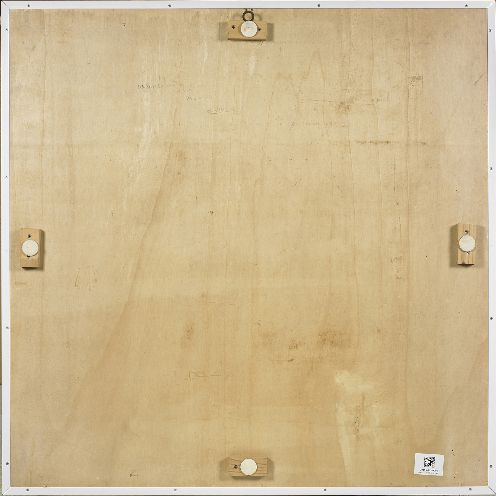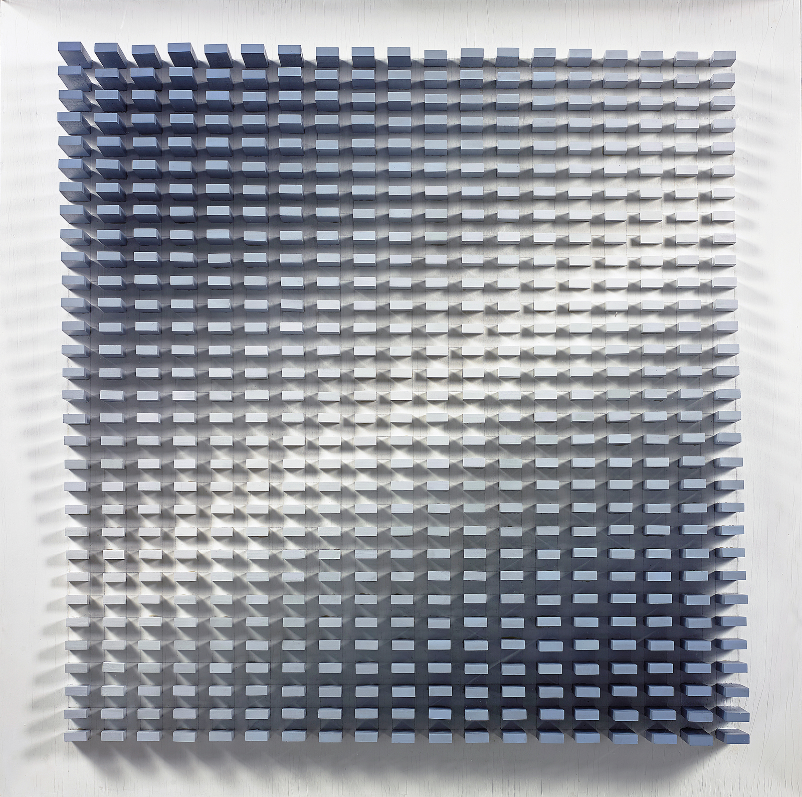 DADAMAINO (1935 - 2004) Rilievo 7374. Tasselli di legno dipinto su tavola. Cm 90,00 x 90,00. Firma e anno al retro. Opera archiviata presso l'Archivio Dadamaino come da documentazione fotografica allegata all'opera riportante il relativo numero d'inventario. Entro teca di plexiglass. 1973 - 1974. Pubblicazioni: Catalogo della mostra "Dadamaino Gonschior Letto Ludwig Tornquist" tenuta presso la Galleria Teamcolore, Milano, 1974. Provenienza: Galleria Team Colore, Milano; Collezione privata, Roma. In merito all'opera Luciano Caramel si esprime nel catalogo citato come segue: "Così la Dadamaino documenta gli effetti - in parte non previsti e non prevedibili in sede progettuale - risultanti da una ricerca sulle relazioni tra colore-volume-forma in rilievi realizzati con moduli di listel-legno di dimensioni diverse (da un massimo a un minimo predeterminati) e verniciati (ciascuno in modo uniforme: ed è questo il motivo della scelta dei moduli invece che di superfici curve, meno controllabili) con colori alla nitro in gradazione cromatiche esattamente proporzionali al volume."