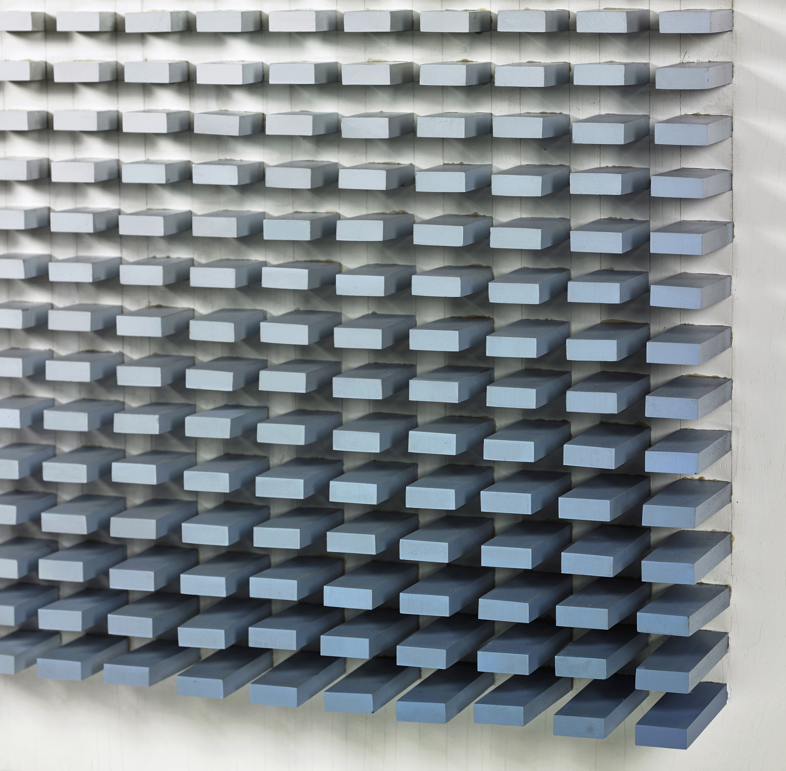 Luciano Caramel describe the work in the cited catalog as follows: "Thus the Dadamaino documents the effects - partly unforeseen and not foreseeable in the projectual phase - resulting from a research on the relations between color-volume-form in reliefs made with listel-wood modules of different sizes (from a maximum to a minimum predetermined) and painted (each uniformly: and this is the reason for the choice of modules instead of curved surfaces, less controllable) with nitro colors in chromatic gradation exactly proportional to the volume. ". Cornice presente