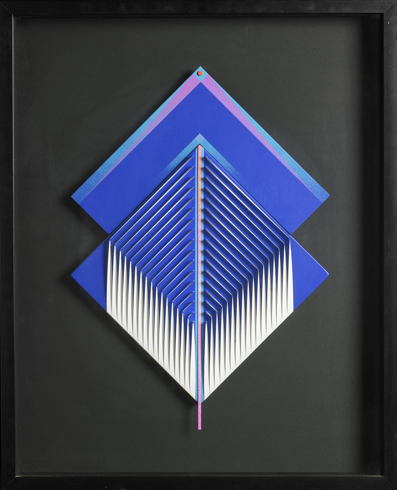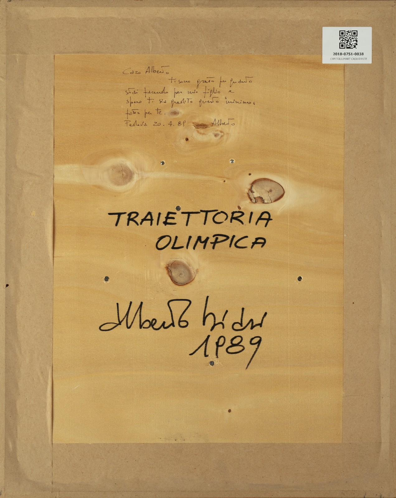 BIASI ALBERTO (n. 1937) Traiettoria Olimpica. 1989. Tecnica mista su tavola. Cm 30,00 x 40,00. Al retro titolo, firma, anno e dedica. Opera archiviata presso l'Archivio Biasi, Artemaab, Milano, come da conferma scritta dell'Archivio stesso. Copia cartacea dell'archiviazione non presente.