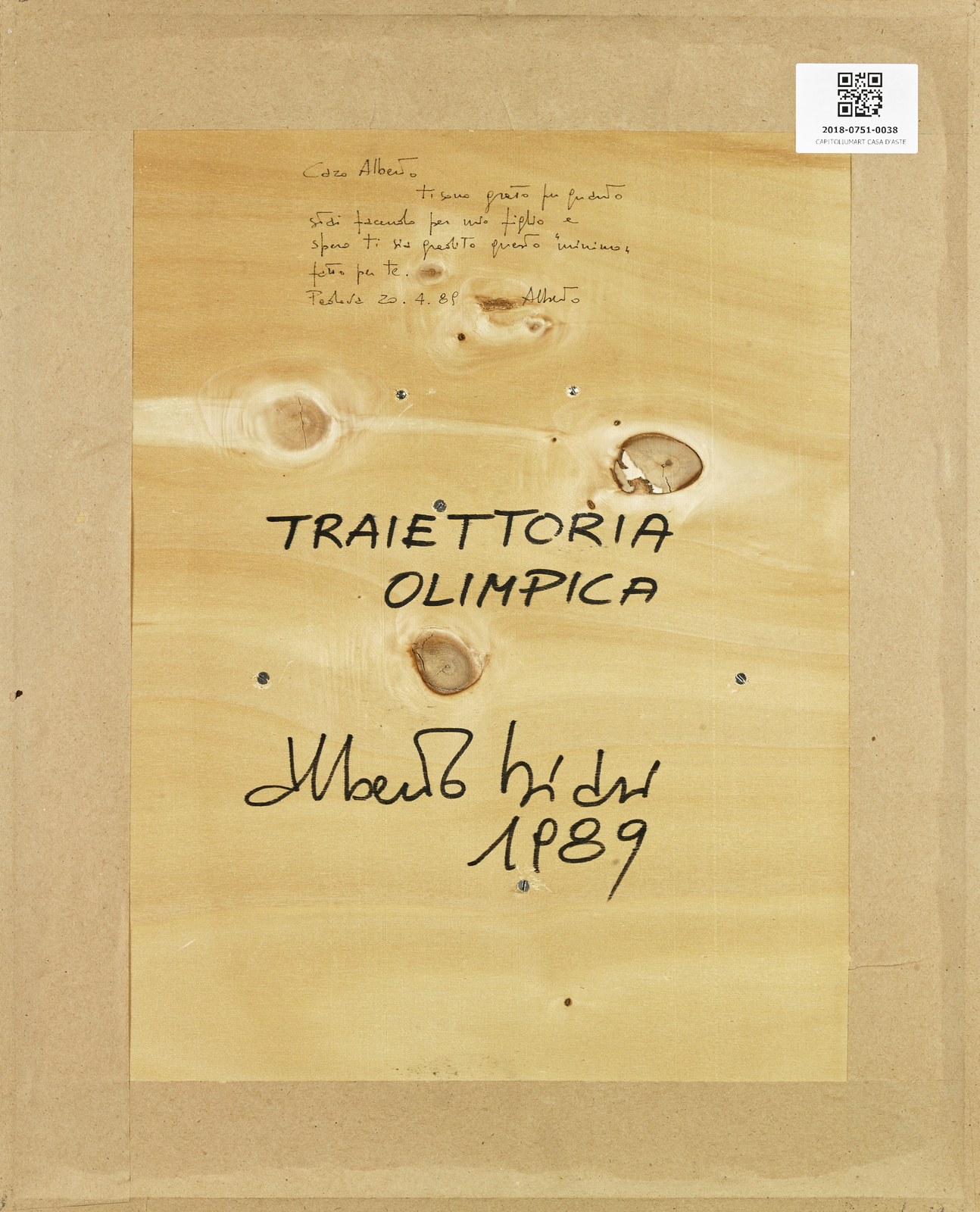 BIASI ALBERTO (n. 1937) Olympic trajectory. 1989. Mixed nomes on board. Cm 30,00 x 40,00. At the back title, signature, year and dedication. Work registrated at Archivio Biasi, Atremaab, Milan (written confirmation).. Cornice presente