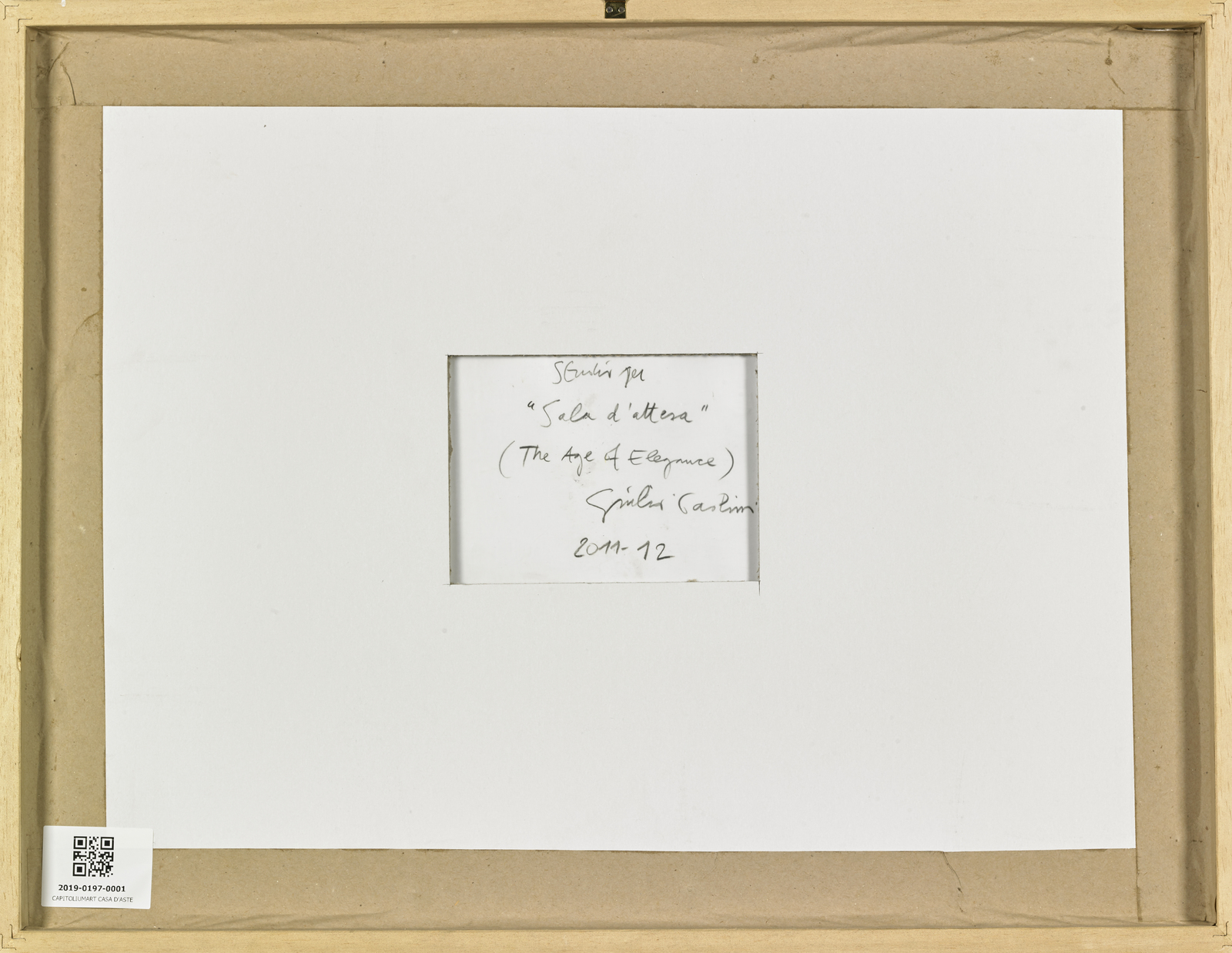 PAOLINI GIULIO (n. 1940) Studio per sala d'attesa.The age of elegance. Fotografia ritoccata a mano. Cm 43,00 x 30,00. Al retro titolo, firma e anno. Autentica dell'artista su fotografia. Pubblicazione: L'Autore che credeva di esistere a cura di Giulio Paolini, Johan & Levi Editore, 2012, pag.117. 2011-2012. Cornice presente