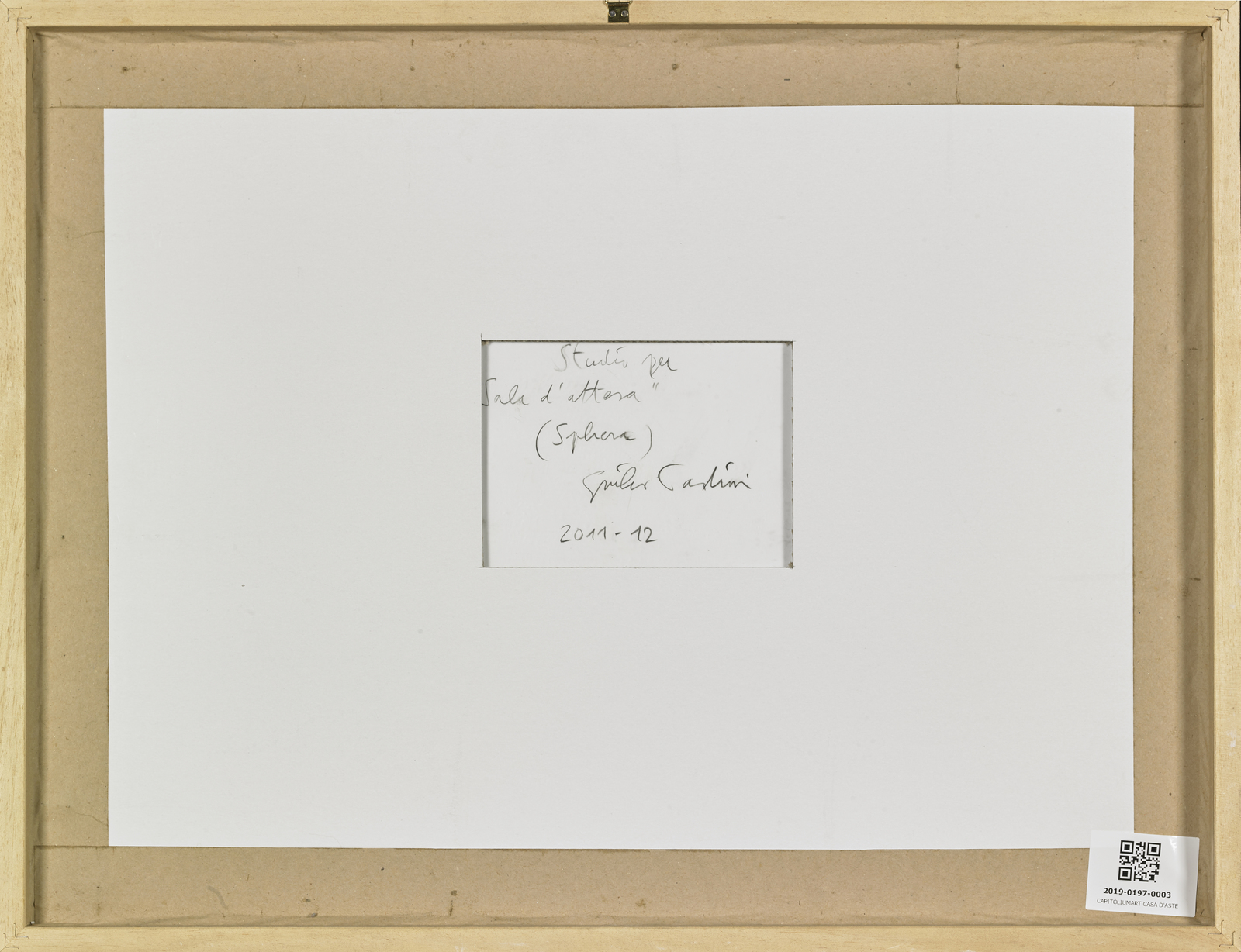 PAOLINI GIULIO (n. 1940) Studio per Sala d'attesa. Sphera. Fotografia ritoccata a mano. Cm 43,00 x 30,00. Al retro titolo, firma e anno. Autentica dell'artista su fotografia. Pubblicazione: L'Autore che credeva di esistere a cura di Giulio Paolini, Johan & Levi Editore, 2012, pag.60. 2011-2012. Cornice presente