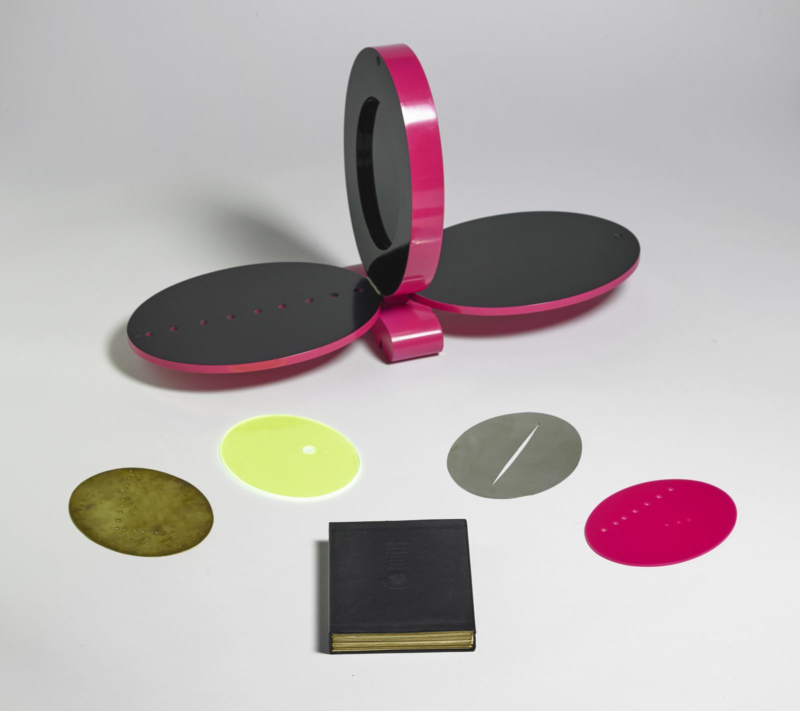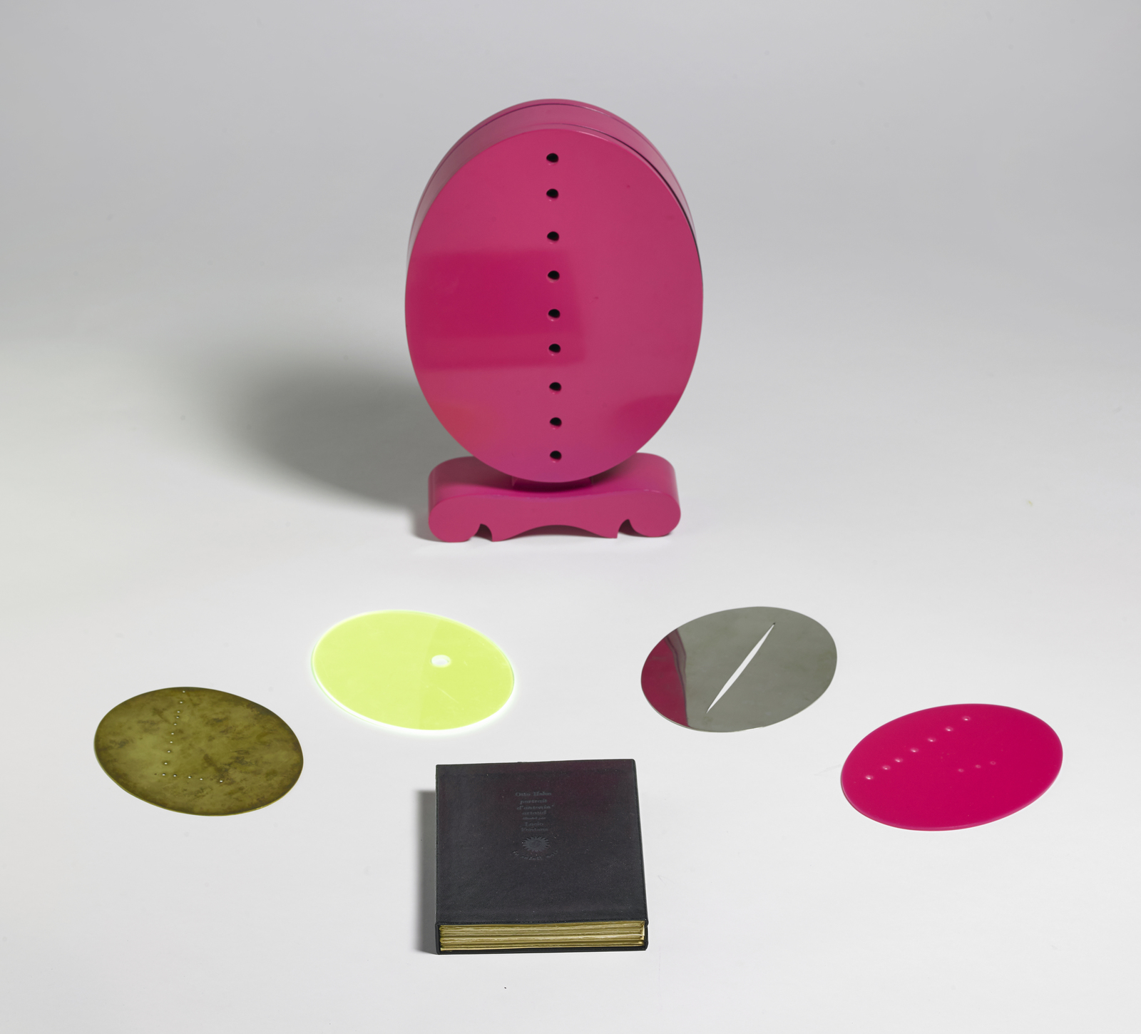 FONTANA LUCIO (1899 - 1960) Portrait d'Antonin Artaud. 1968. Multiple. Cm 21,00 x 37,00 x 7,00. Work composed of six elements: a) numbered and signed HC X / X l.fontana (on the base) container in lacquered wood 36.5x24x6.5 cm b) numbered H.C. X / X (in the door) printed book 19.6x14.8x2.3 cm c) numbering and monogram EA X L.F. (bottom center) opaque perspex cm 18.6x14.5 d) numbered EA X (bottom center) translucent perspex cm 18.7x14.5 e) monogram and numbering L.F. EA X (bottom center) steel 18.5x14.5 cm f) numbered EA X (bottom center) copper 18.6x14.5 cm. Made in 1968 by Du Soleil Noir editions in 80 copies numbered in Arabic numerals + 10 out-of-commerce HC copies numbered in Roman numerals (6). Bibliography: Harry Ruhé, Camillo RIgo, Lucio Fontana, graphics, multiples and more ..., Tuja Books, p.164. Fontana created this series of perforated sheets contained in a sculptural container as "illustrations" and contribution to a book by Otto Hahn about the French iconoclastic dramatist, actor, poet, artist and director Antonin Artaud (1896-1948). Through his theories of art and theater and his experiences with drug addiction, Artaud became a figure of enormous interest among artists in the 1960s.