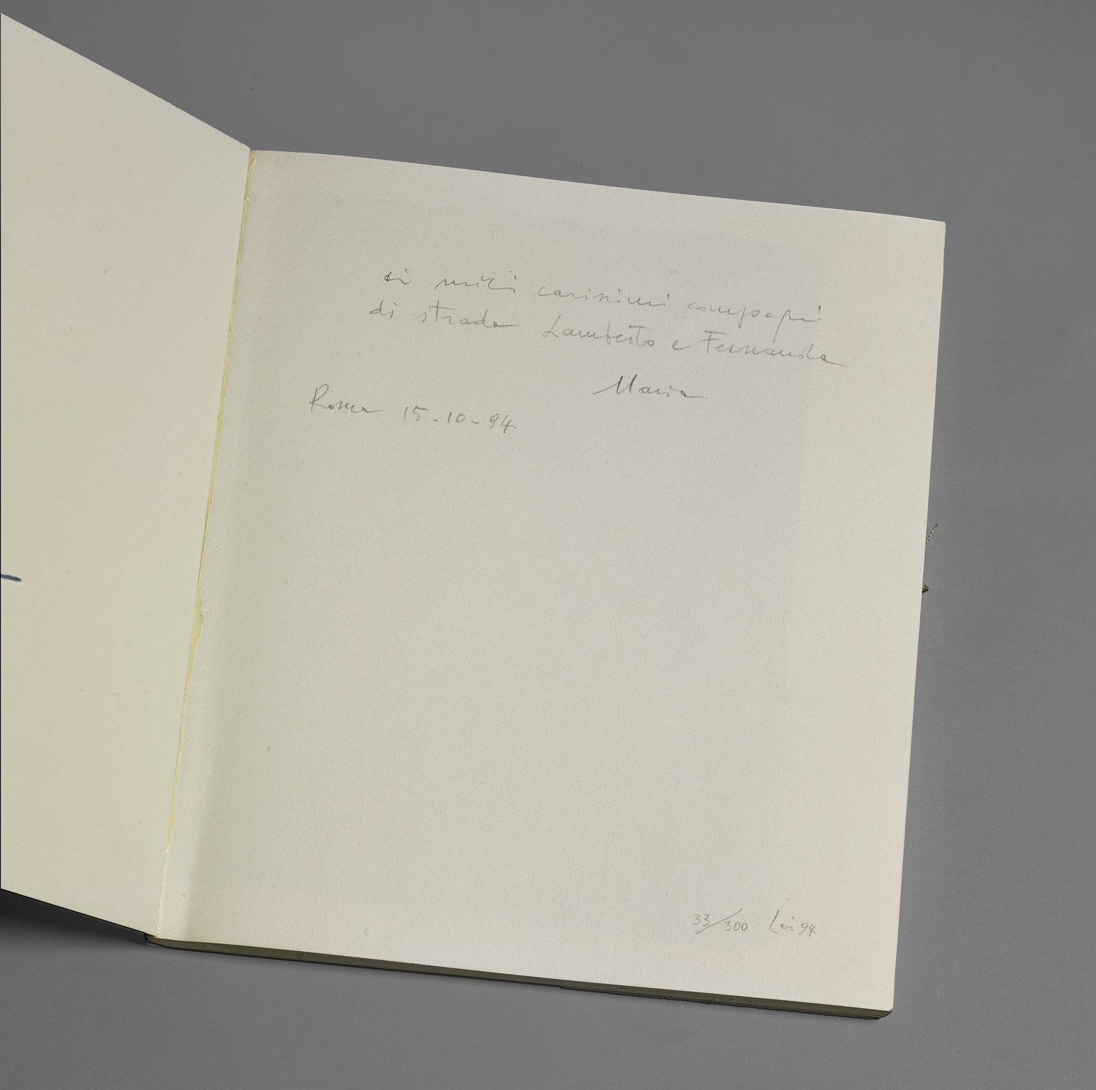 LAI MARIA (1919 - 2013) Il Dio distratto. 1994. Libro d'artista. Cm 28,00 x 32,00. 33/300. Tiratura, firma, anno e dedica all'interno. A.D. arte duchamp. Il libro è un'interpretazione per immagini del racconto che Giuseppe Dessì scrisse per Maria Lai, il libro non è di quelli usuali: non presenta parole ma ricami e oltre ad essere numerato e firmato, presenta fili non solo sulla copertina, ma anche su alcune delle pagine interne. Opera archiviata presso l'Archivio Maria Lai, Lanusei, Nuoro, come da documentazione fotografica allegata all'opera riportante il relativo numero d'inventario.