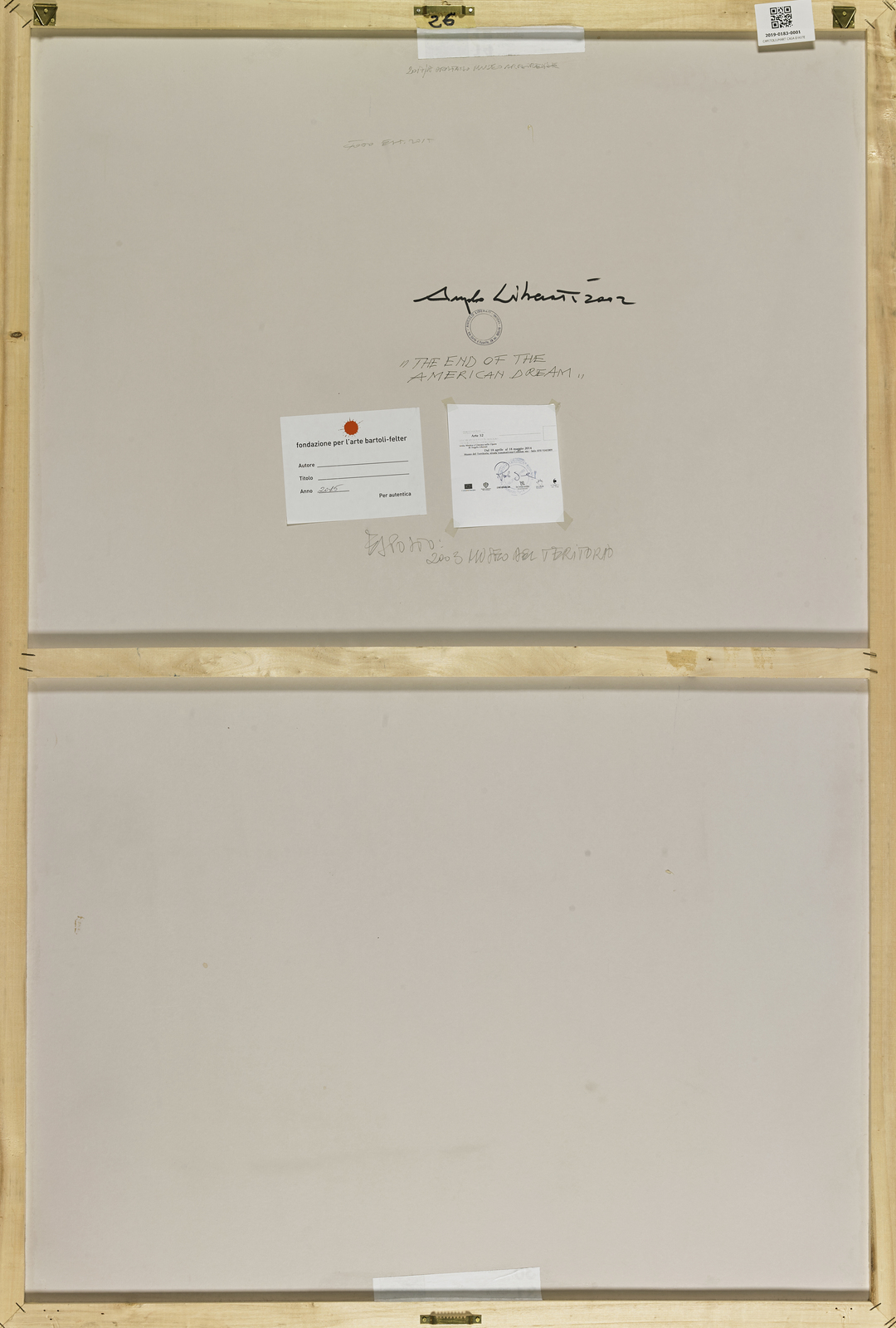 LIBERATI ANGELO (n. 1946) The end of American dream. 2002. Mixed media on cardboard. Cm 80,00 x 120,00. Signature and year lower right. At the back title, signature, year, artist's stamp and Museo del Territorio 18 April -18 May 2014 label. Cornice presente