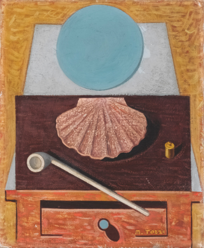 MARIO TOZZI 1895 - 1979 COQUILLE SUR LA TABLE signed, oil on canvas. Executed in 1928 firmato olio su tela cm 46x38 Eseguito nel 1928 Opera registrata presso l'Archivio Tozzi, Foiano della Chiana, con il n. 2288 L'opera è accompagnata da certificato su fotografia rilasciato dall'Archivio Tozzi, Foiano della Chiana PROVENANCE Collezione Franco Quadri, Milano Ivi acquisito dall'attuale proprietario