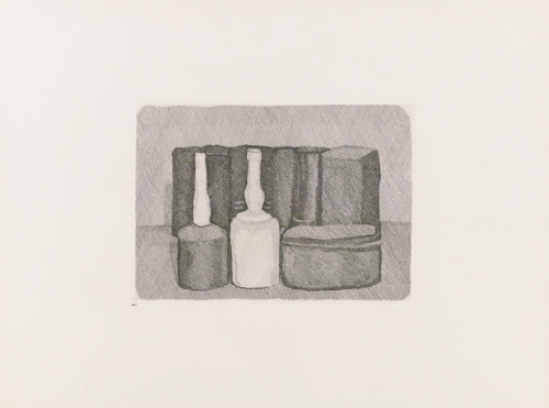 GIORGIO MORANDI 1890 - 1964 NATURA MORTA CON NOVE OGGETTI signed, numbered 45/100 and dated 1954, etching on copper firmato, numerato 45/100 e datato 1954 acquaforte su rame cm 18x25 LETTERATURA L. Vitali, L'opera grafica di Giorgio Morandi, Torino 1964, n. 115, illustrato