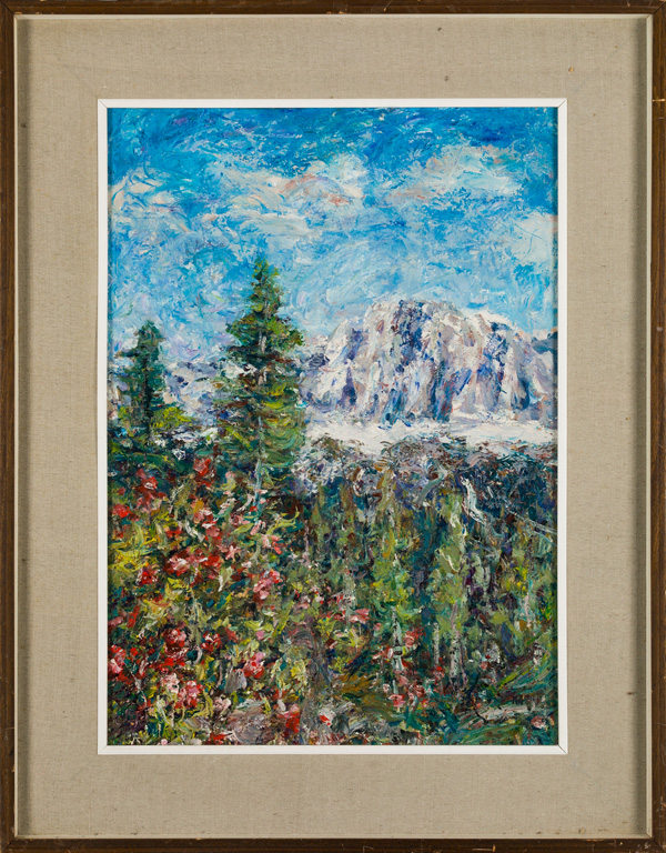 CARLO AIMETTI (1901-1980)Paesaggio con rododendri (Dolomiti), 1974Olio su...