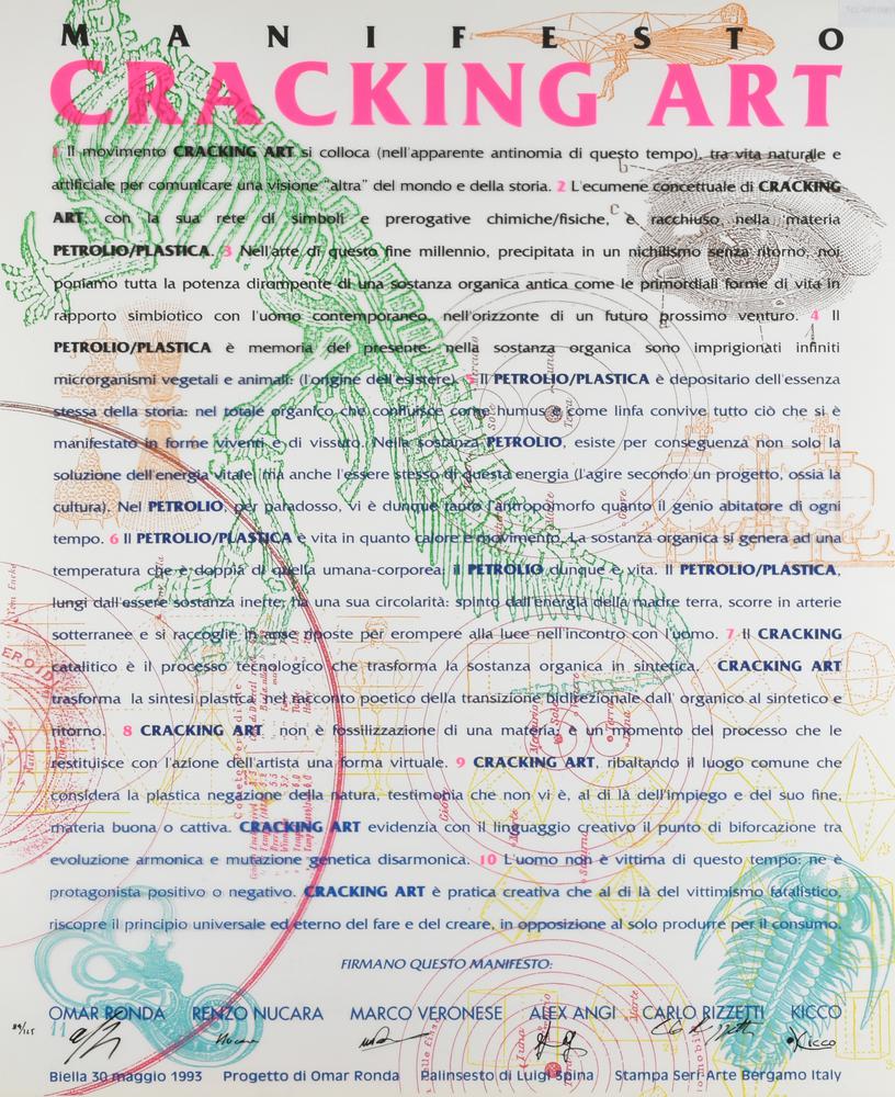 Cracking Art Group MANIFESTO CRACKING ART serigrafia su pvc neutro, cm 90x70 esemplare 84 su 125 sul fronte: firma di tutti i membri del gruppo eseguita nel 1994 Edizione Seri-Arte, Bergamo
