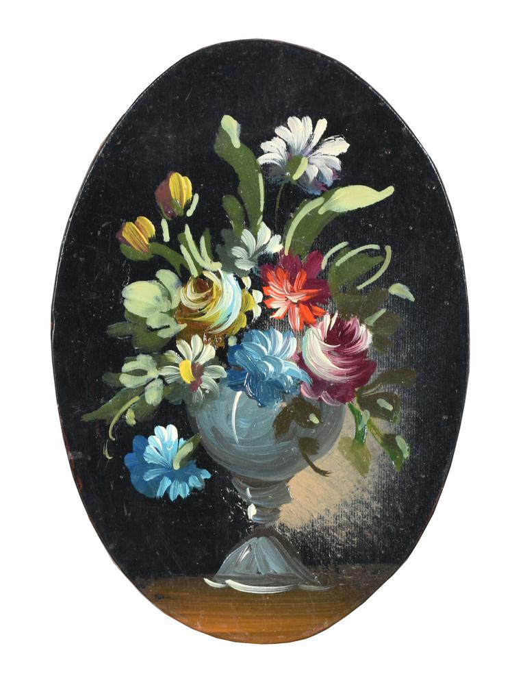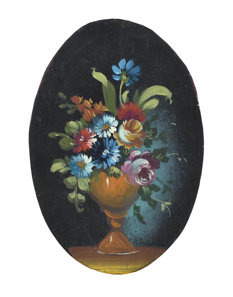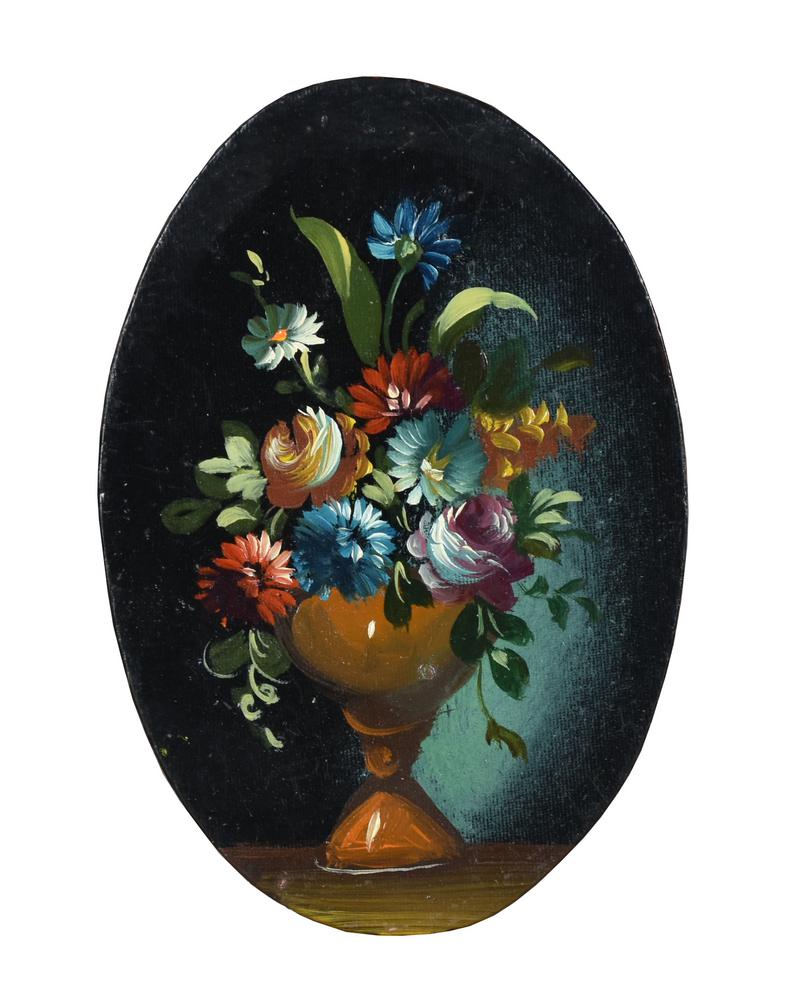 Anonimo NATURA MORTA olio su cartone telato ovale, cm 14,5x10 ciascuno (3)