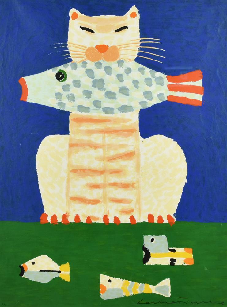 Laura Fiume GATTO CON PESCE serigrafia su tela, cm 80x60 sul fronte: firmato e numerato prova d'artista