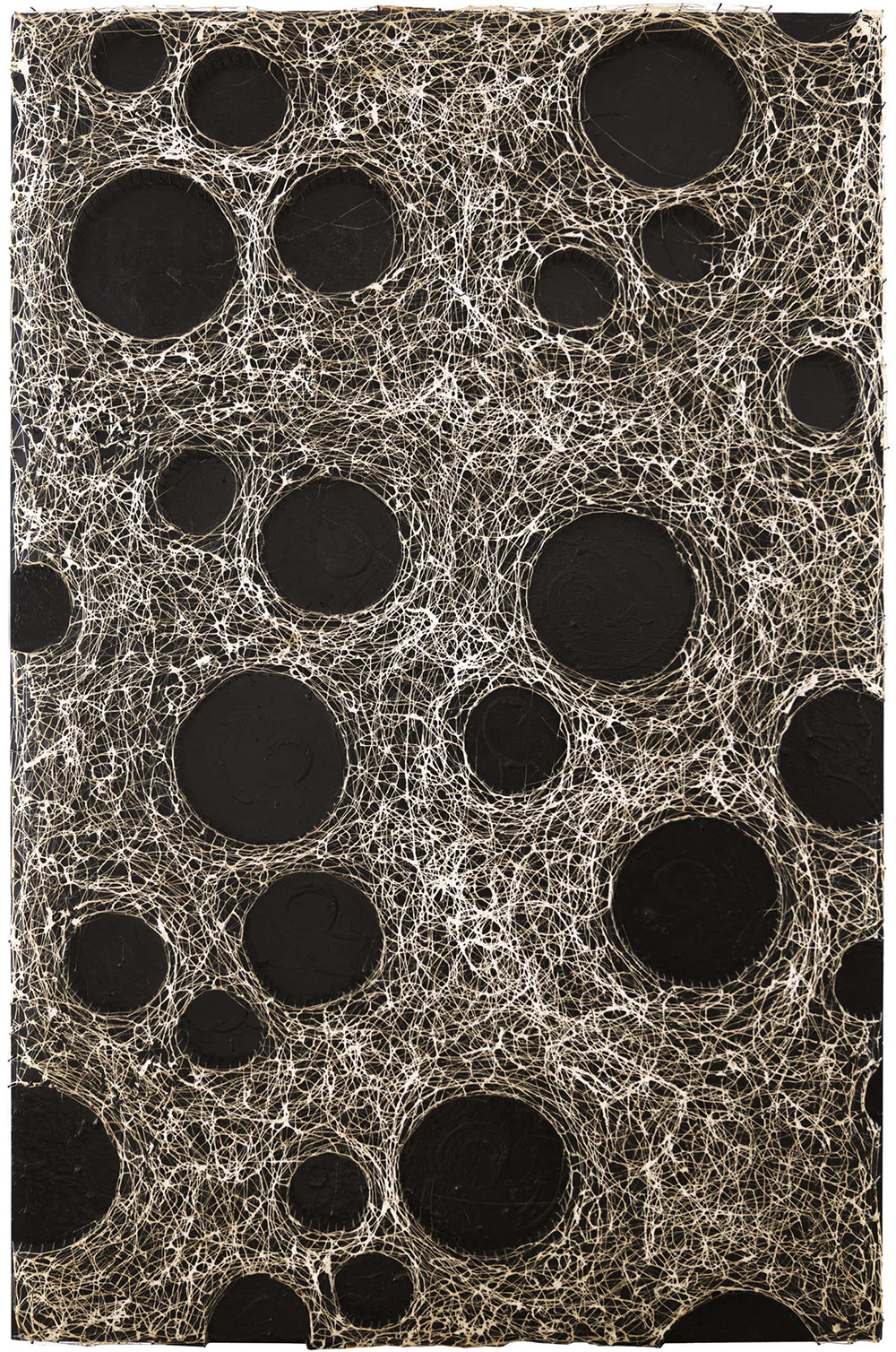 Davide Nido 1966 - 2014 Gocce, 1993 Chiodi, nylon e silicone su tavola di legno 122.7 x 80 x 5 cm (48.31 x 31.50 x 1.97 in. ) Firma, data, titolo sul retro Provenienza Collezione privata, Milano Certificato L'opera è accompagnata da certificato di autenticità su fotografia rilasciato da Paola Barnabei, Archivio Davide Nido, nel 2019. N. 00001/1993