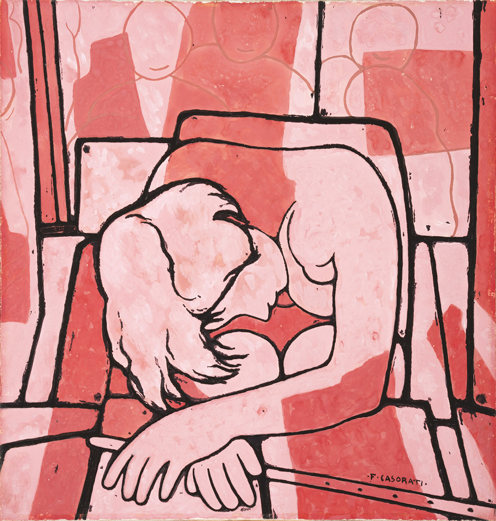 Felice Casorati 1883 - 1963 Ragazza che dorme, [1958] Tempera su carta intelata 48 x 46.5 cm (18.90 x 18.31 in. ) Firma in basso a destra Etichetta Galleria La Bussola, Torino sul retro Timbro Galleria d'Arte Sianesi, Milano sul retro Etichetta Galleria d'Arte Maggiore, Bologna sul retro Provenienza Galleria La Bussola, Torino (1963, inv. n. 70094) Galleria d'Arte Sianesi, Milano Galleria d'Arte Maggiore, Bologna Collezione privata, Bologna Letteratura M. M. Lamberti e P. Fossati, "La naturalezza cosciente. Felice Casorati (1883-1963)", Ed. Marescalchi, Bologna , 1986 [ contiene le testimonianze critiche di P. Rizzi,G. Ruggeri e F. Solmi], p.102, ill. col. (come “Le amiche” e dimensioni errate) G. Bertolino, F. Poli, "Felice Casorati, Catalogo Generale. I dipinti (1904 - 1963)" , Umberto Allemandi & C., Torino, 1995, Vol. I, n. 1137, (descrizione p. 444) Certificato Arch. F. C., n. 806