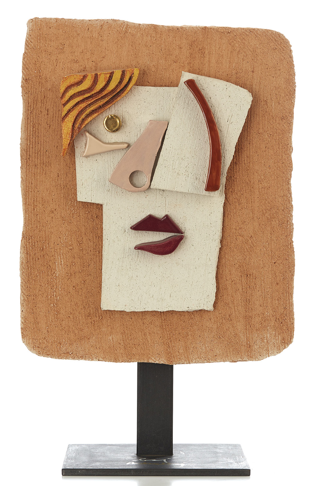 Enrico & Andrea Baj 1924 & 1968 - 2003 Teodora moglie Androfilo, 1991 61 x 37.5 x 20 cm (24.02 x 14.76 x 7.87 in. ) Firma su base Assemblaggio di vari tipi di argille, porose e non, di colore bianco e rosso, parzialmente smaltate in rosa, rosa chiaro, rosso cremisi; interventi pittorici in giallo, arancio e marrone; finiture a terzo fuoco in oro Provenienza Collezione privata, Forlì Letteratura L. Caprile, G. C. Bojani, "I Baj ceramisti", Ed. Centro, 1991, p. 62, n. 35 Il presente catalogo è stato pubblicato in occasione della Mostra organizzata dal Comune di Faenza, nel Palazzo delle Esposizioni in Faenza, nell'ambito delle Manifestazioni internazionali della Ceramica d'Arte Contemporanea 1991, dal 14 settembre al 27 ottobre