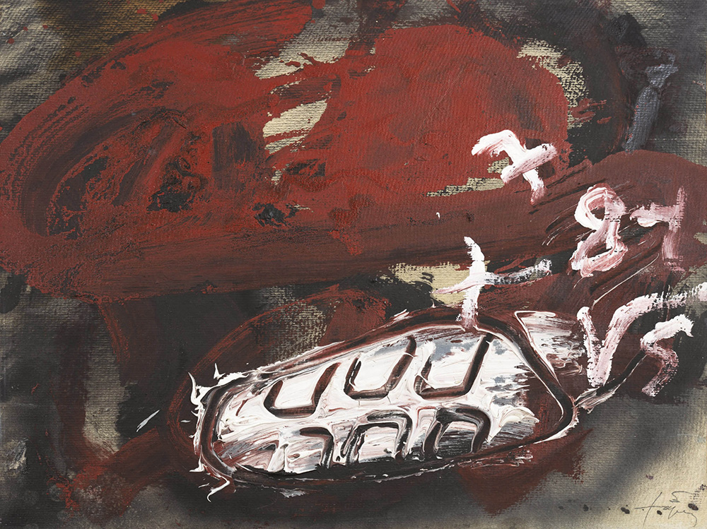 Antoni Tàpies 1923 - 2012 Dents, 1984 Pittura su carta incollata su tela 41.5 x 55 cm (16.34 x 21.65 in. ) Etichetta della Galleria Maeght Lelong, Parigi sul retro Etichetta della Galleria Grafiart, Turku (Finlandia) sul retro Provenienza Galleria Maeght Lelong, Parigi Galleria Grafiart, Turku (Finlandia) Collezione privata, Bergamo Esposizione Galleria Maeght Lelong, Parigi,1984 ( cat. n. 36) p. 39 (c) Letteratura A. Agusti, M.J. Borja - Villel, M. Tàpies, "Tàpies Obra Completa 1982 - 1985 ", Fundació Antoni Tàpies, Barcellona Polígrafa, 1998, Vol. V, p. 264, n. 4771
