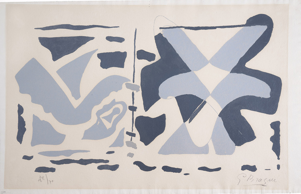 Georges Braque 1882 - 1963 Si je mourais là-bas Incisione originale su legno a colori 46.4 x 72.5 cm (18.27 x 28.54 in. ) Misure della lastra: 44,5 x 67 cm Firma in basso a destra Es. 22 / 70 in basso a sinistra Doppia pagina utilizzata come frontespizio alla fine del volume "Si je mourais là-bas" di Guillaume Apollinaire. Esso contiene 18 incisioni su legno a colori di Georges Braque, di cui due doppie pagine utilizzate come frontespizio all'inizio e alla fine del libro, una pagina utilizzata come copertina e una come ornamento per una pagina di protezione fuori testo. Editore Louis Broder, Parigi, 1962 Tiratura Féquet et Baudier, Parigi Opera di 78 pagine, formato 35,5 x 47 cm Finito di stampare nel dicembre del 1962 a Parigi Provenienza Galleria de Foscherari, Bologna Collezione privata, Bologna Letteratura D. Vallier, “Braque l'oeuvre gravé catalogue raisonné”, Ed. Flammarion, 1982, Losanna, n. 181, p. 247 ( descrizione) p. 254 (ill. b/n)