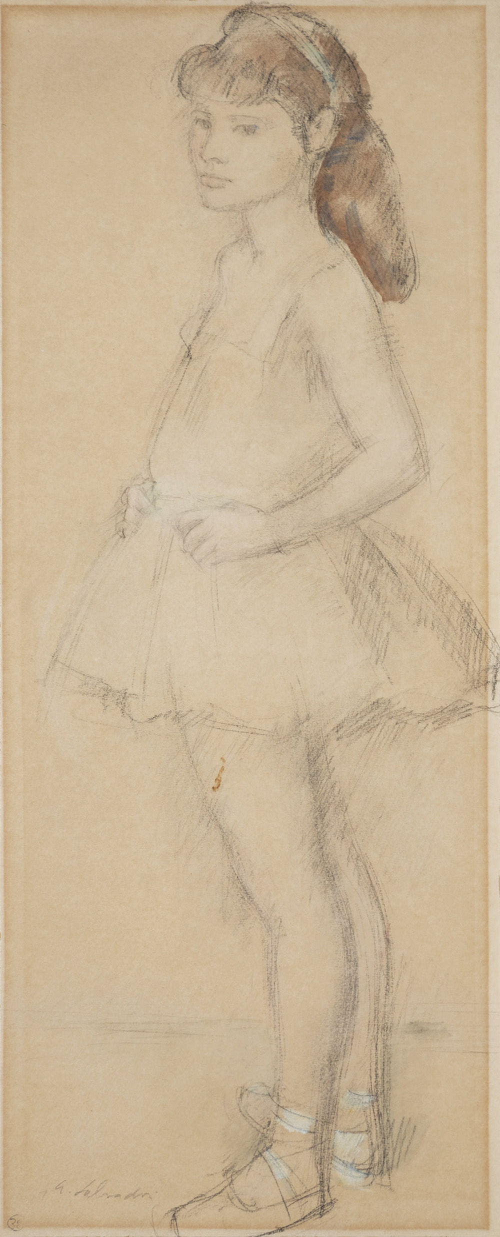 Aldo Salvadori 1905 - 2002 Ballerina, 1950 ca. Matita e acquerello su carta 45.7 x 18.5 cm (17.99 x 7.28 in. ) Firmato in basso a sinistra Provenienza Collezione privata, Milano Certificato L'opera è accompagnata da certificato di autenticità di Luigi Cavallo rilasciato il 04/03/2019.