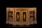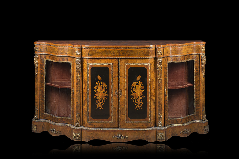 Credenza di forma sagomata lastronata in radica decorata a filettature in bosso e bois de rose, ante laterali sagomate in vetro e centrali in legno ebanizzato intarsiato a fiori. Montanti, fasce e riquadrature in metallo dorato. Inghilterra, secolo XIX (cm 214x110x48) (difetti)