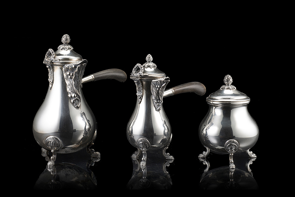 Servizio da tè e caffè in argento composto da caffettiera, teiera e zuccheriera. Anse in corno, beccucci decorati a foglie a tutto tondo, piedi caprini. Argentiere Fratelli Leone, Milano (g lordi 1130 ca.) (lievi difetti)