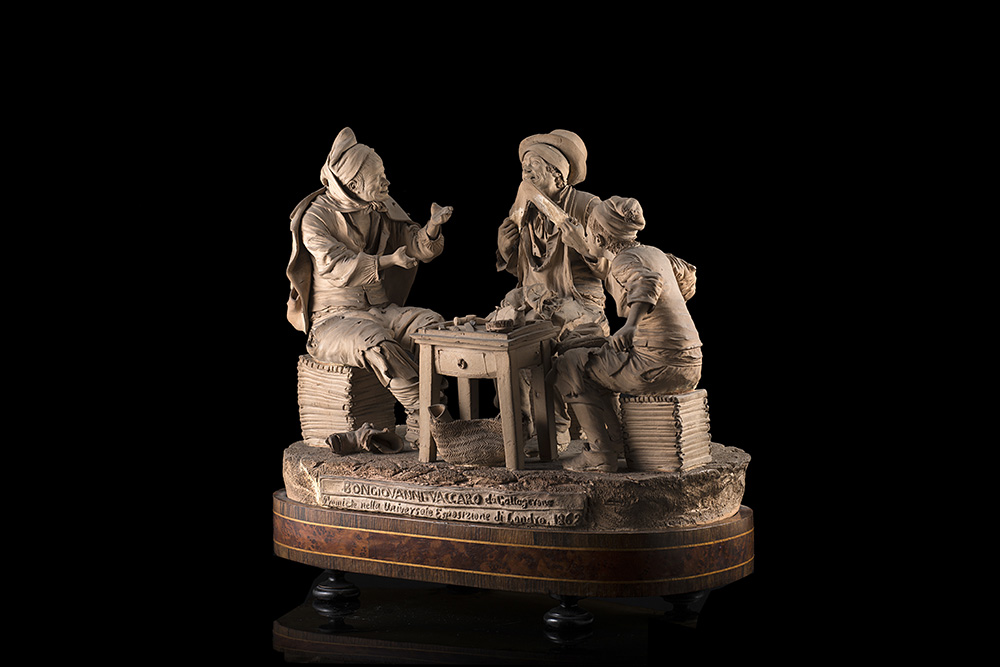 Bottega dei Vaccaro Bongiovanni (Caltagirone, secolo XIX) "Il calzolaio" gruppo in terracotta (cm 37x27x22) Inscritto "Bongiovanni Vaccaro da Caltagirone, premiata nella Universale Esposizione di Londra 1862". Base lastronata e filettata in legno chiaro (mancanze)