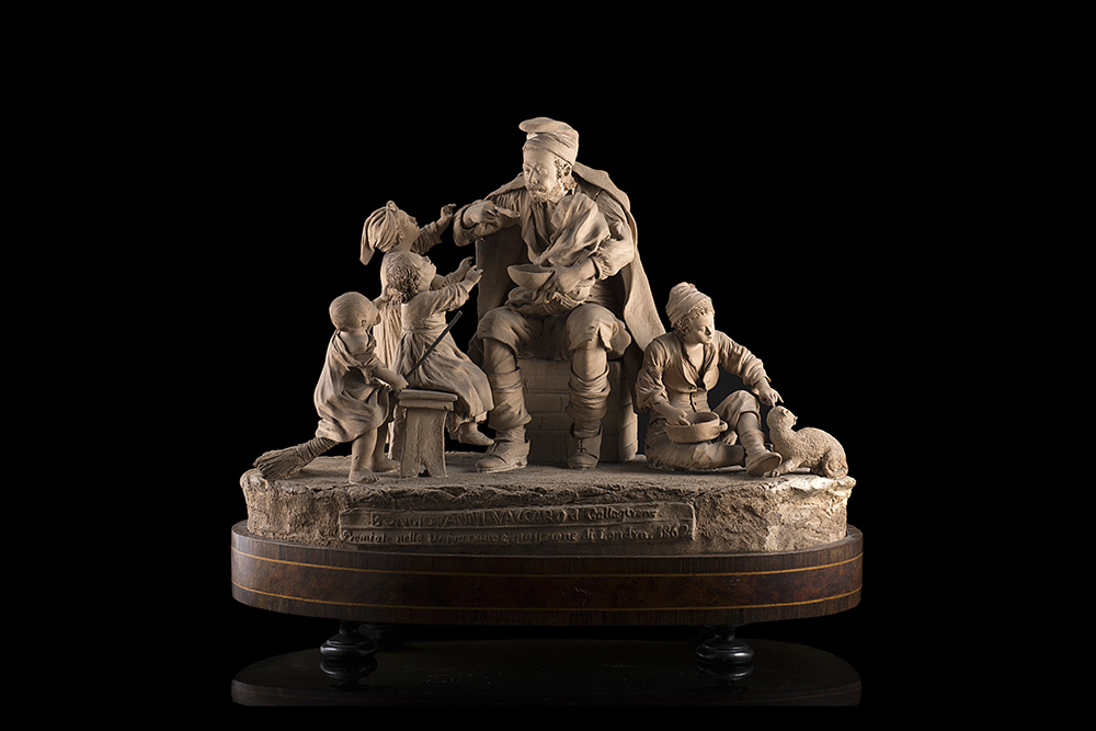 Bottega dei Vaccaro Bongiovanni (Caltagirone, secolo XIX) "Scena di genere" gruppo in terracotta (cm 41x27x20) Inscritto "Bongiovanni Vaccaro da Caltagirone, premiata nella Universale Esposizione di Londra 1862". Base lastronata e filettata in legno chiaro (mancanze)