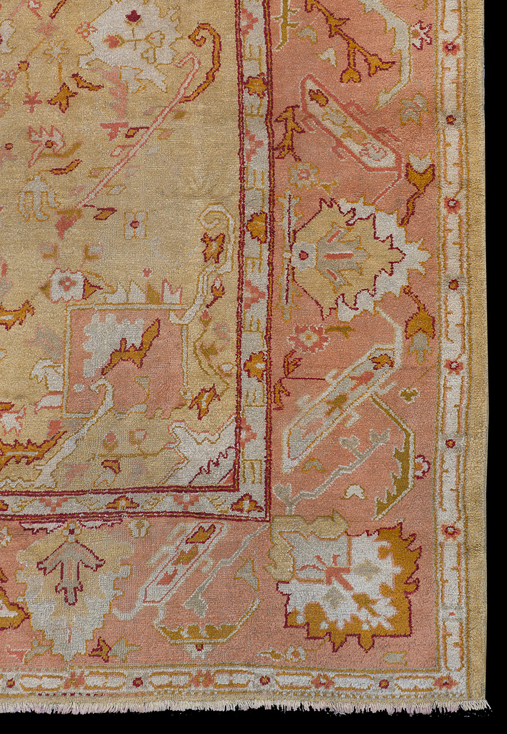 Decoro geometrico con piccolo medaglione su fondo giallo. Bordura principale a meandro su fondo rosa (cm 502x395) (difetti)