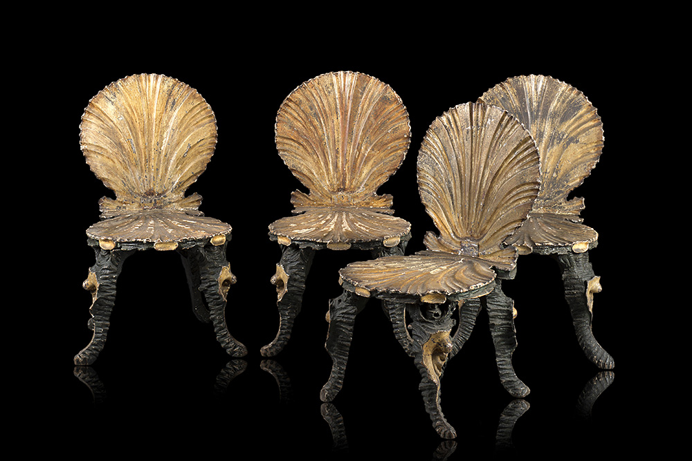 Gruppo di quattro sedie in legno intagliato, laccato e dorato con schienale, seduta e gambe a conchiglia. Veneto, seconda metà del secolo XIX (difetti)