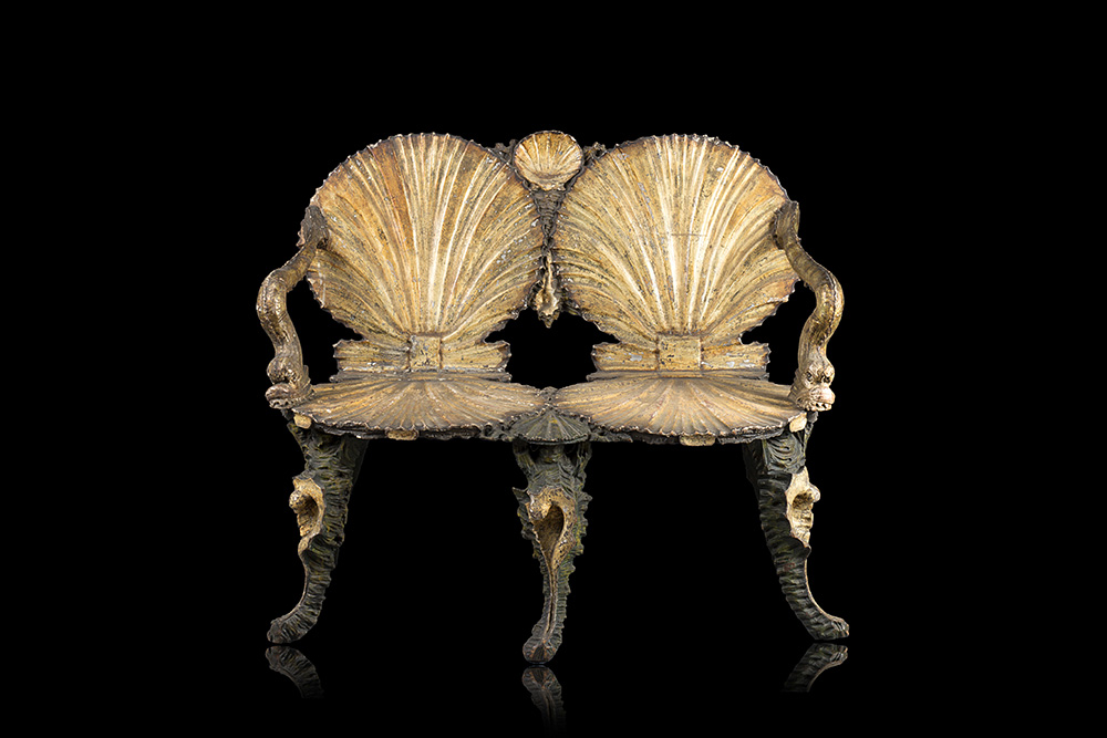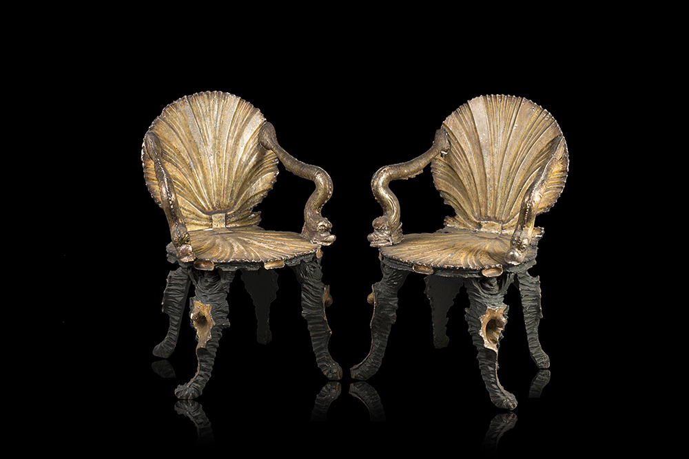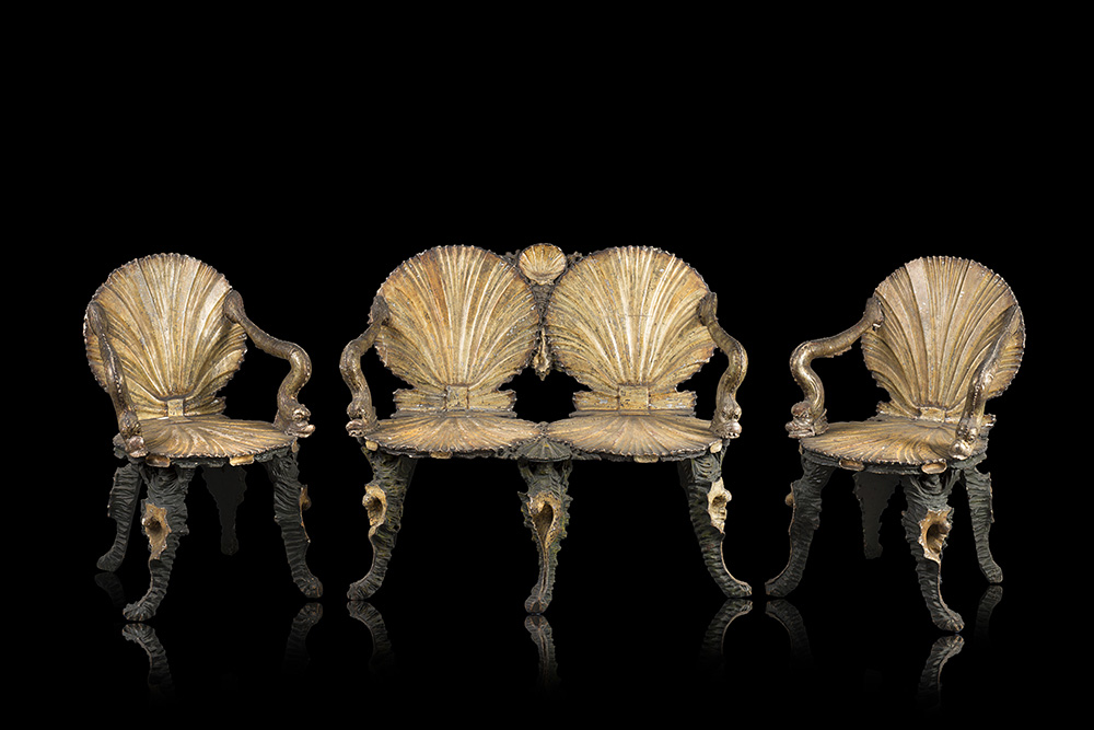 Fornitura da salotto in legno intagliato, laccato e dorato, composto da un divanetto e due poltrone con schienale, seduta e gambe a conchiglia e braccioli scolpiti a mostri marini. Veneto, seconda metà del secolo XIX (largh. divano cm 108) (difetti)
