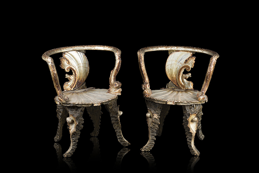 Fratelli Testolini (attr.) Coppia poltrone a pozzetto in legno intagliato, argentato, dorato e parzialmente dipinto con schienale, seduta e gambe in forma di conchiglia. Braccioli e parte dello schienale scolpiti a cavallucci e mostri marini. Veneto, seconda metà del secolo XIX (difetti)