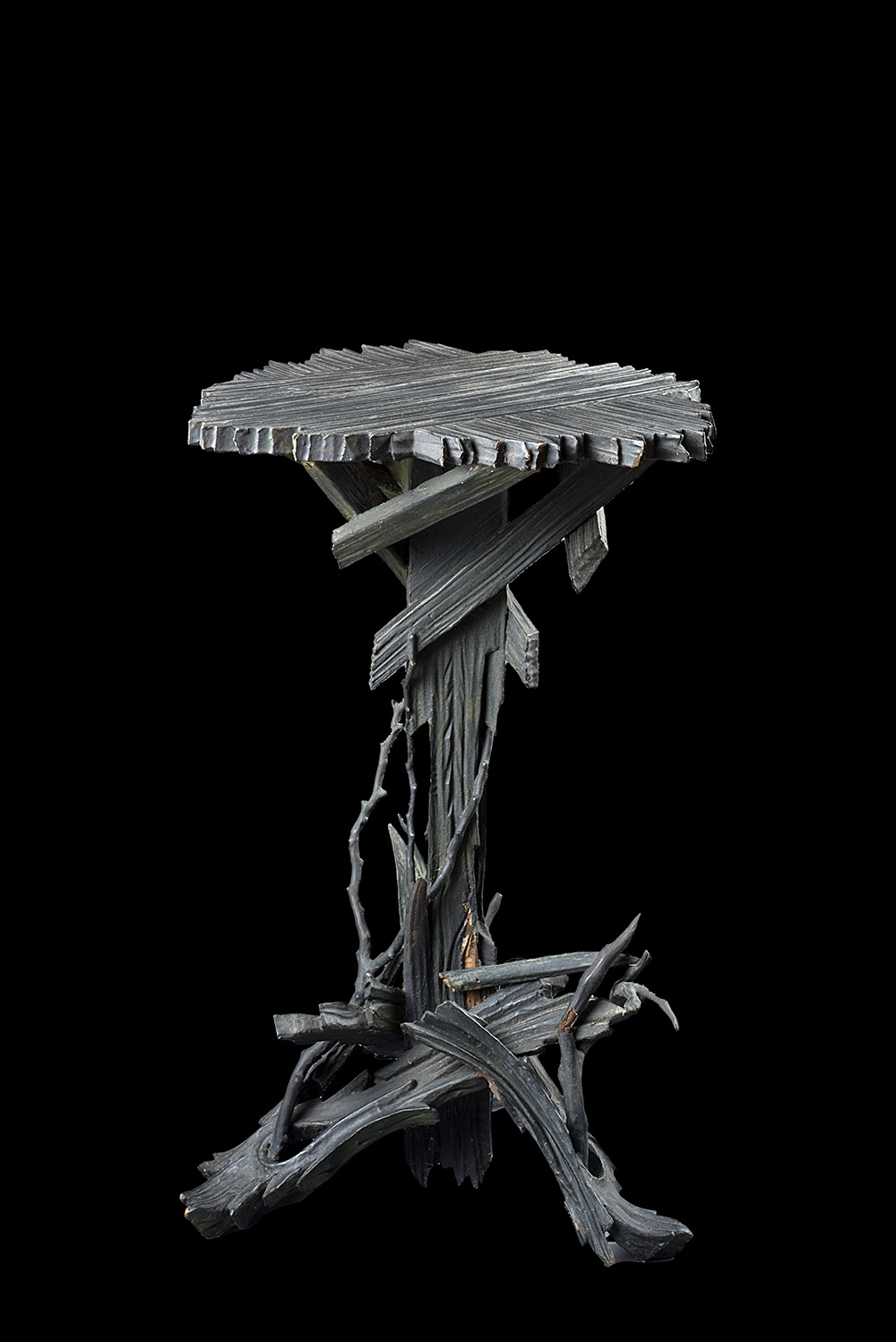 Tavolino in legno ebanizzato e dipinto, intagliato a elementi naturalistici. Fine secolo XIX - inizio secolo XX (cm 18x30x22) (difetti)