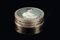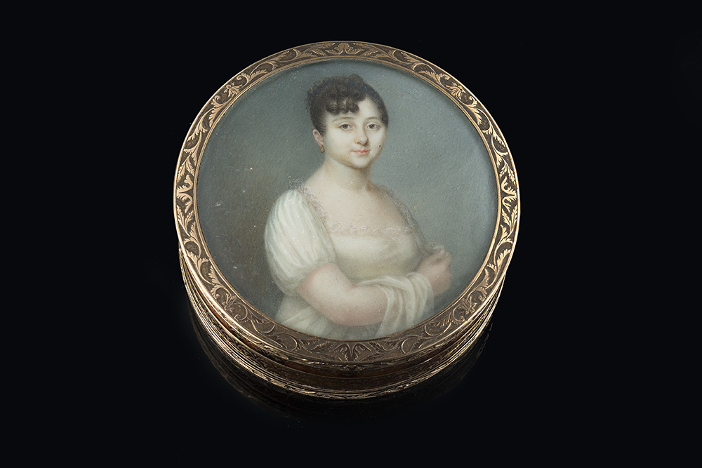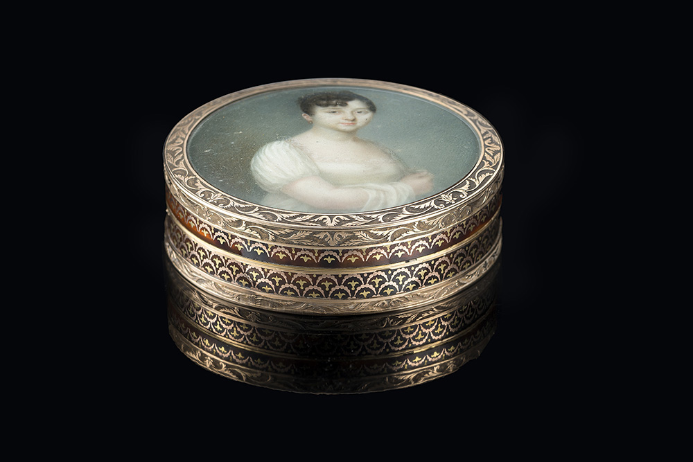 Tabacchiera in tartaruga intarsiata in oro giallo e rosa a motivi stilizzati e ghiere cesellate a foglie. Coperchio con miniatura di gentildonna in veste bianca. Parigi, fine secolo XVIII - inizio secolo XIX, orafo SV con cuore non identificato (g lordi 112) (d. cm 8) (difetti e restauri)