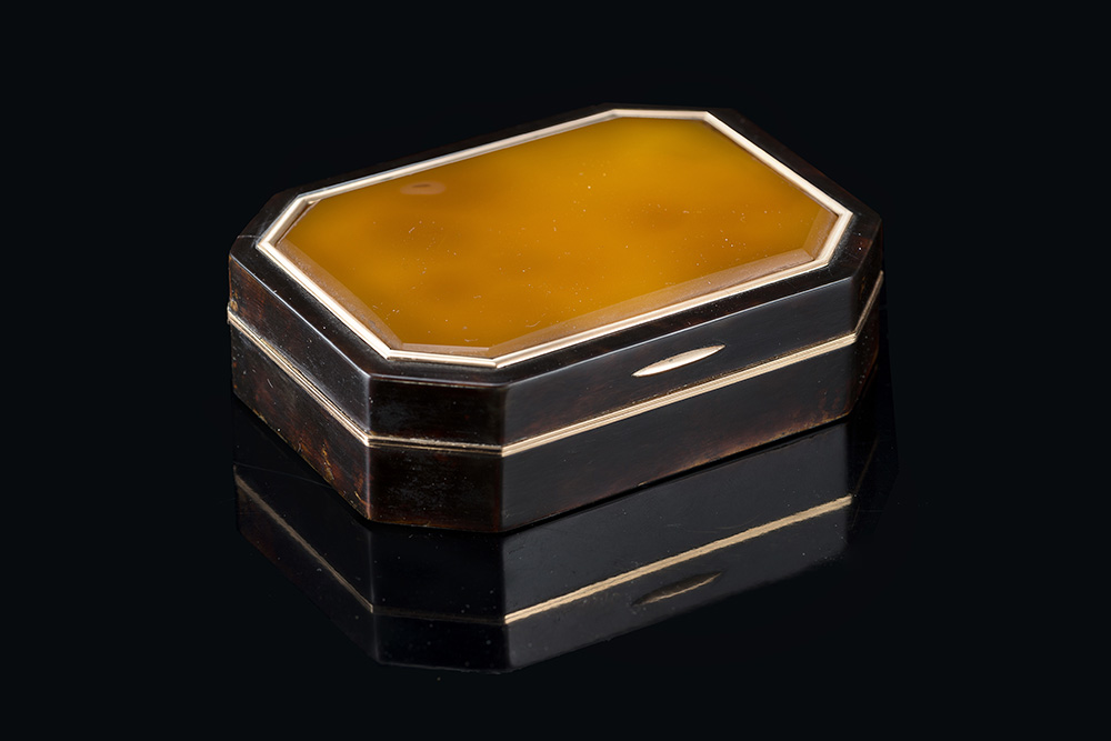 Tabacchiera di forma ottagonale in oro rosa lastronato in tartaruga, coperchio in "marmo onice arancio". Francia, secolo XIX, punzoni abrasi (g lordi 135) (cm 8,8x6,5)