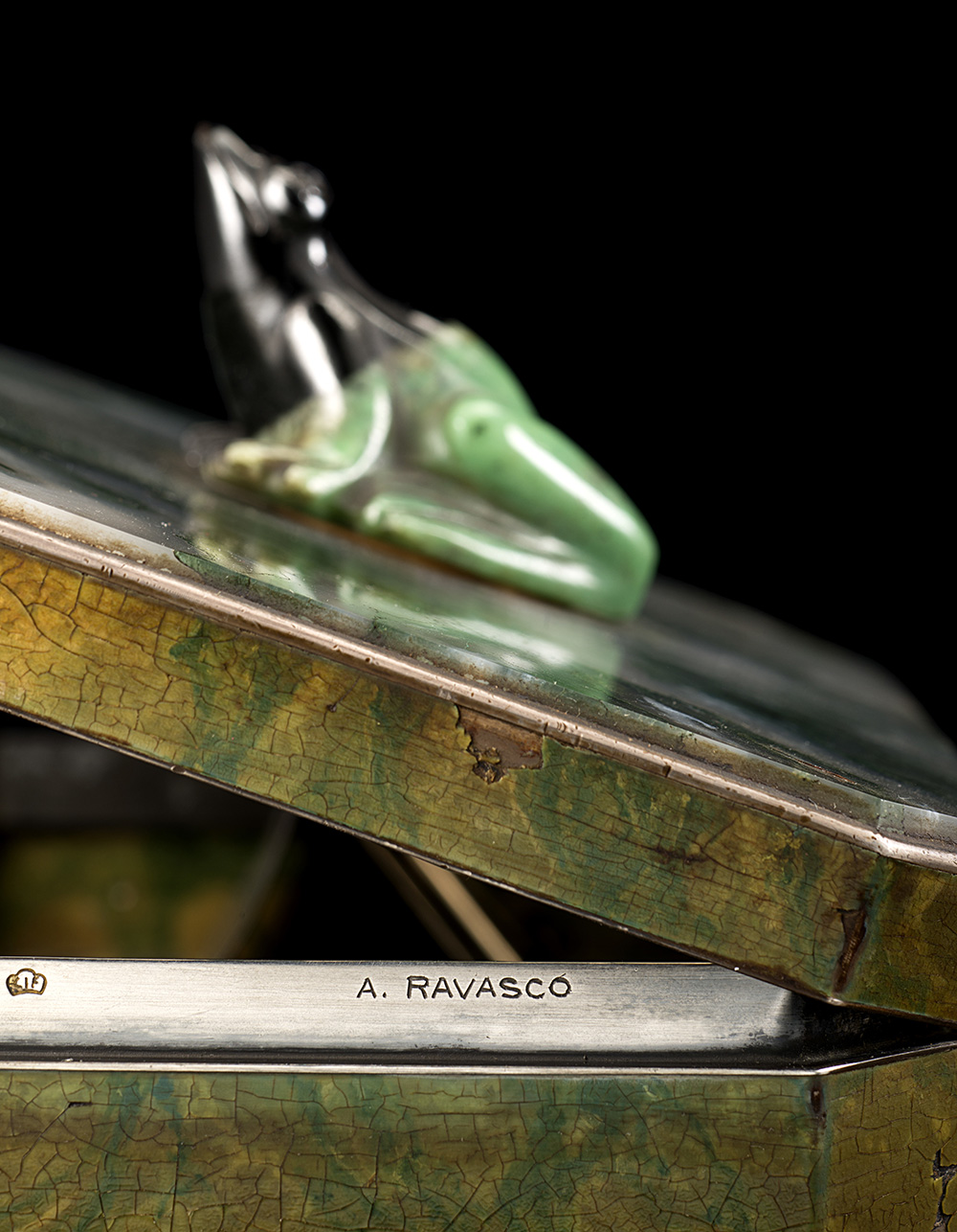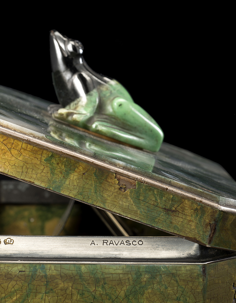 Scatola in argento e quarzo muschiato sormontata da figura di rana a tutto tondo in crisoprasio su matrice. Fascia in metallo rifinita a finto marmo con smalti policromi sui toni del verde e giallo. Firmata A. Ravasco nella fascia e numerata 04466, punzoni CIF entro corona, argentiere Carlo Ilario e Figli (cm 15x10x4) (restauri e lievi difetti)