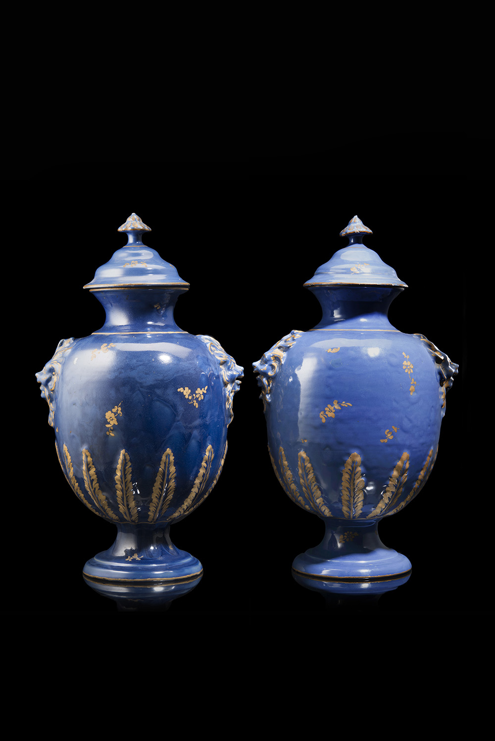 Manifattura della seconda metà del secolo XVIII. Coppia di vasi con coperchio in maiolica blu, decorati in rilievo e in ocra a teste leonine nelle anse e a foglie e fiori sul corpo. Presa del coperchio a trottola (h. cm 40) (difetti e restauri)