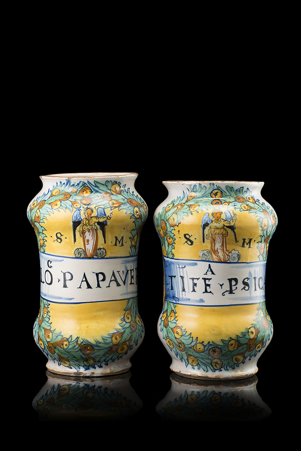 Manifattura di Deruta, secolo XVI. Coppia di albarelli in maiolica "a rocchetto" decorati in policromia su fondo bianco e centrati da ghirlanda di fiori e frutti, cartigli con scritte farmaceutiche sormontate da angeli entro cifre S.M. (h. cm 18,3) (difetti)
