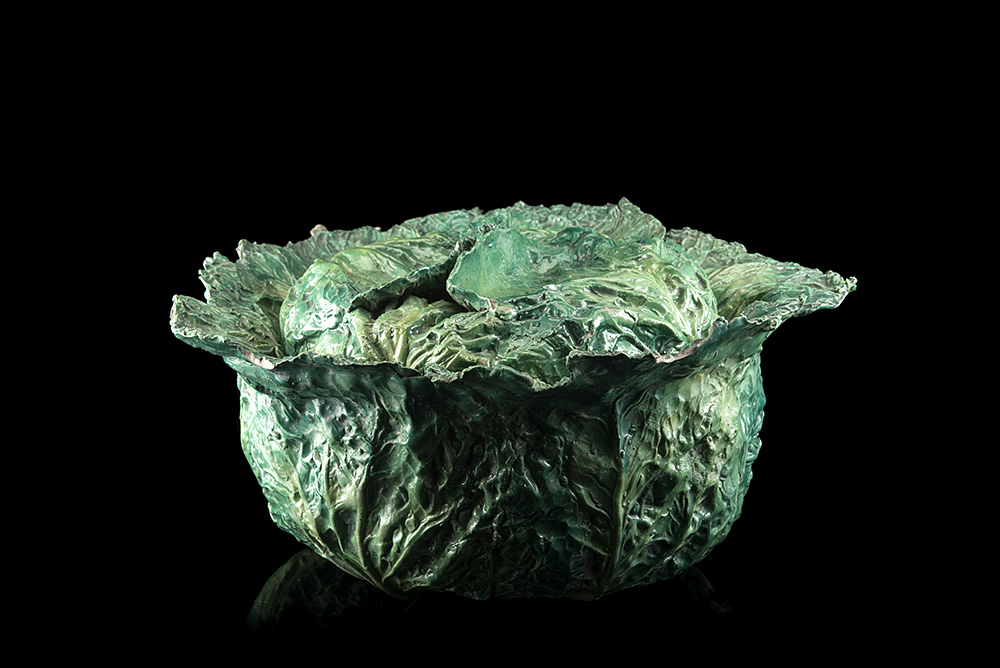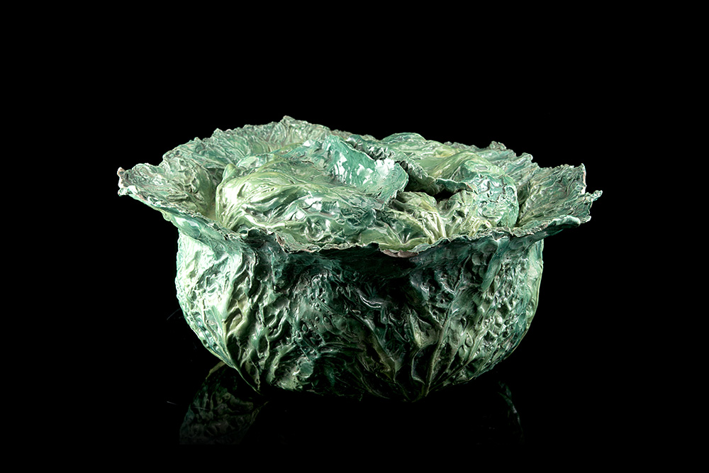 Manifattura italiana. Zuppiera con coperchio in maiolica a forma di verza (cm...